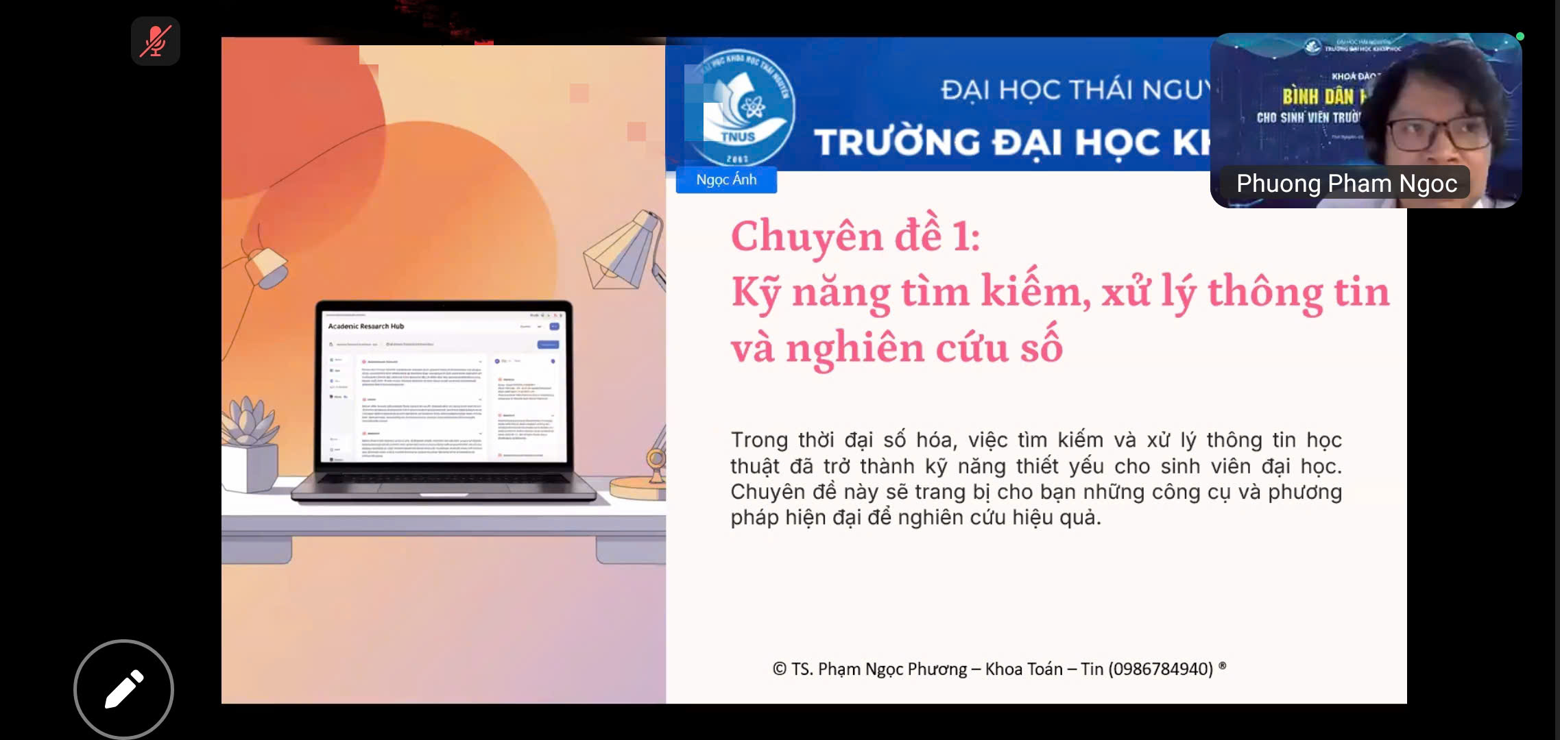 Trang bị kỹ năng sử dụng hiệu quả Google Scholar, thư viện số và các cơ sở dữ liệu học thuật; hướng dẫn phân tích độ tin cậy của nguồn thông tin, trình bày kết quả nghiên cứu bằng infographics và biểu đồ trực quan; đồng thời rèn luyện kỹ năng quản lý thời gian, công việc bằng các công cụ như Google Calendar và Gitmind.
