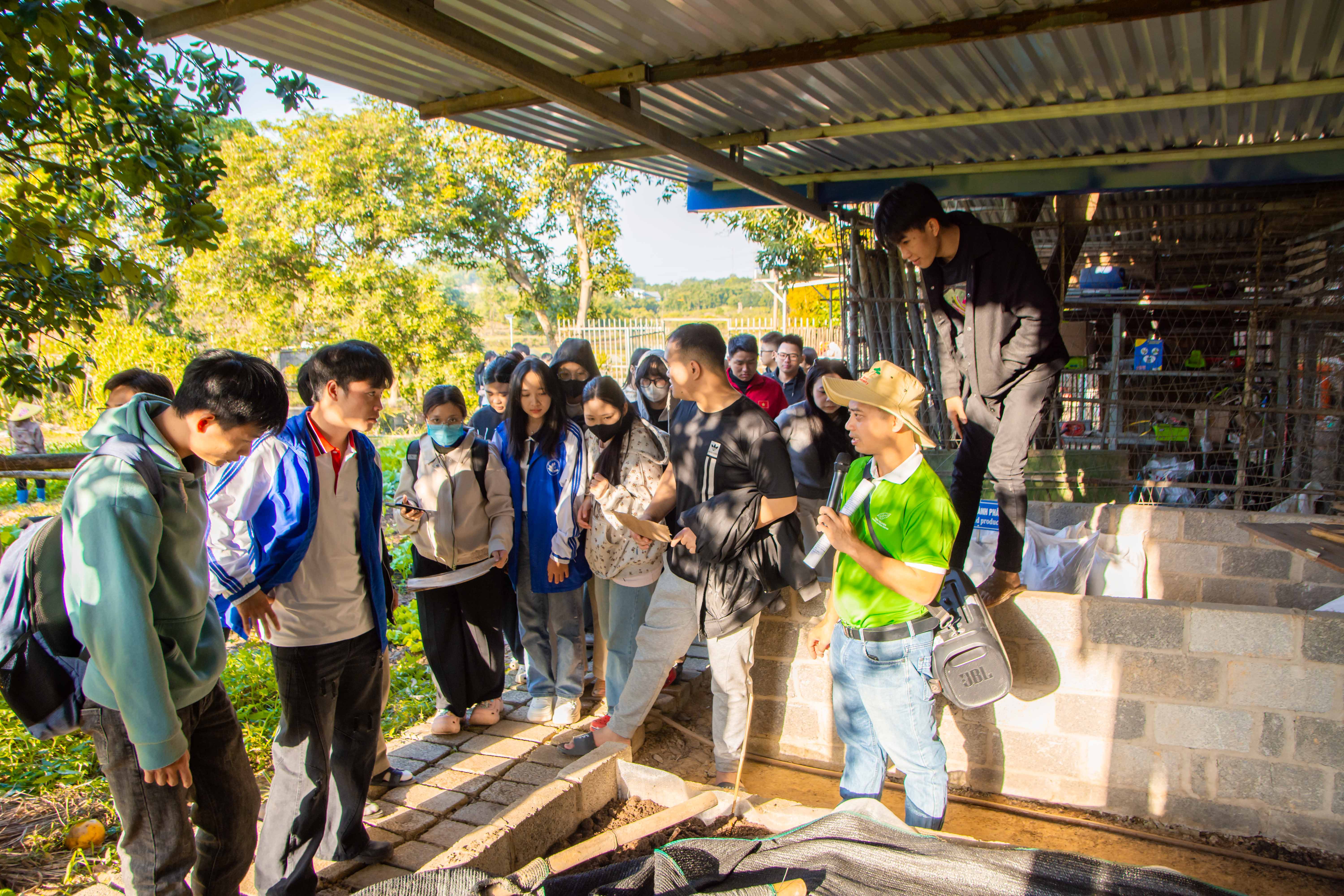 Trạm 3 là mô hình canh tác tuần hoàn VAC (vườn – ao – chuồng), thể hiện hệ thống nông nghiệp sinh thái quy mô nhỏ, trong đó phụ phẩm của quá trình này trở thành đầu vào của quá trình khác. Mô hình này góp phần giảm lãng phí lương thực, thực phẩm, tiết kiệm chi phí, hạn chế phát thải khí nhà kính và nâng cao nhận thức về sản xuất – tiêu dùng bền vững. Bên cạnh đó, mô hình nuôi trùn quế giúp chuyển hóa chất thải hữu cơ thành phân bón chất lượng cao, phục hồi đất và xây dựng hệ thống canh tác thân thiện với môi trường. Tại trạm này, đoàn còn được tìm hiểu mô hình kho lạnh tự nhiên bảo quản nông sản sau thu hoạch với chi phí thấp, không phát thải, tiết kiệm năng lượng; cùng mô hình nhà sấy năng lượng mặt trời phục vụ sấy khô nông sản, dược liệu và gia vị.