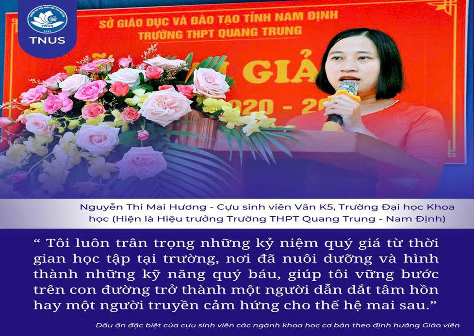 · Đào Quỳnh Anh (Văn học K7): Tổ trưởng Tổ Khoa học Xã hội, Trường THCS Hoàng Văn Thụ, Thái Nguyên