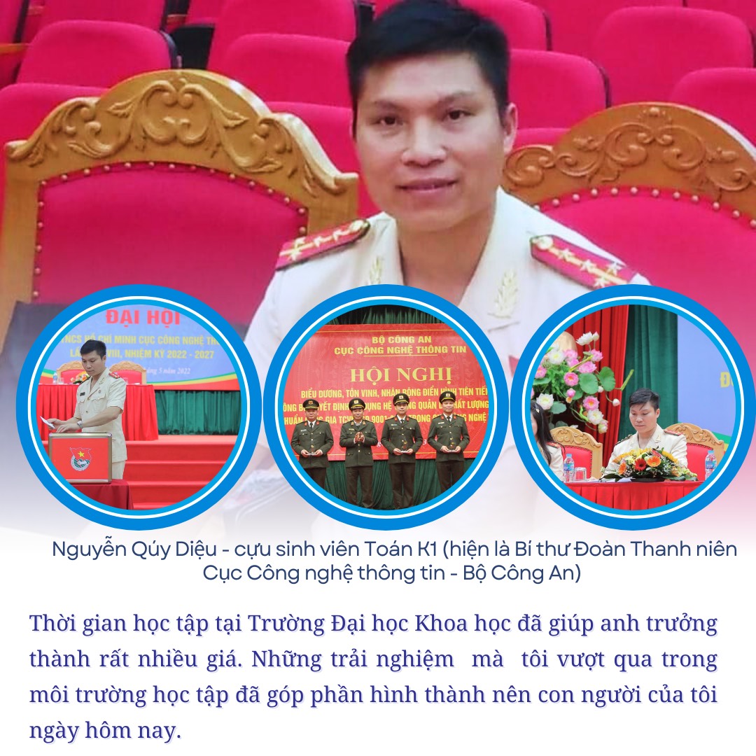 Nguyễn Quý Diệu, cựu sinh viên Toán K1, hiện là Bí thư Đoàn Thanh niên Cục Công nghệ Thông tin - Bộ Công An. Anh là một tấm gương sáng trong việc ứng dụng kiến thức vào thực tiễn. Với vai trò của mình, Diệu không chỉ lãnh đạo các hoạt động của đoàn thanh niên mà còn tham gia tích cực vào các dự án công nghệ thông tin nhằm nâng cao hiệu quả công tác quản lý nhà nước. Anh luôn nỗ lực tạo ra môi trường làm việc sáng tạo và khuyến khích các bạn trẻ tham gia vào các hoạt động đổi mới sáng tạo.