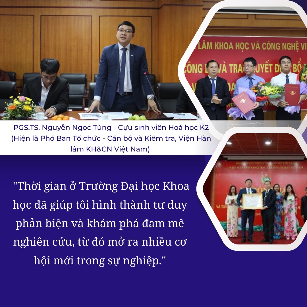 Nhắc đến Nguyễn Ngọc Tùng, các thầy cô trong Khoa Hóa học Trường ĐHKH không thể quên được chàng trai lớp trưởng lớp cử nhân Hóa học K2 có gương mặt điển trai, thông minh và cực kỳ năng động trong các hoạt động của lớp, của Trường. Ngay từ những ngày đầu bước vào giảng đường đại học, Nguyễn Ngọc Tùng đã là một thành viên tích cực trong lớp và được các bạn tín nhiệm bầu làm lớp trưởng. Thành tích 4 năm học đại học của Tùng cũng thật đáng nể. Ra trường với tấm bằng loại giỏi, Tùng được nhận vào làm việc tại Viện Hóa học, Viện Hàn lâm Khoa học và Công nghệ Việt Nam. Năm 2023, Nguyễn Ngọc Tùng vô cùng vinh dự khi được Nhà nước phong tặng học hàm Phó Giáo sư.