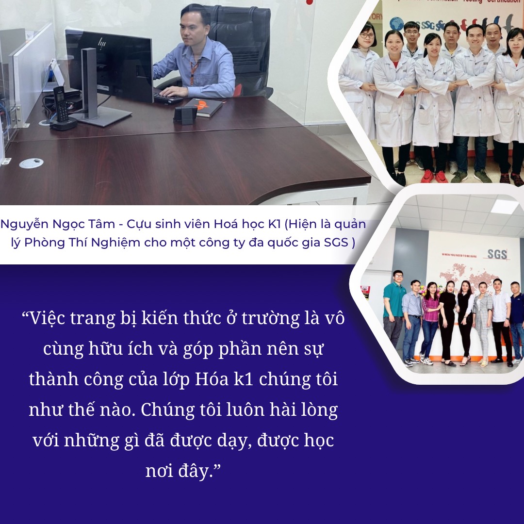 Nguyễn Ngọc Tâm, cựu sinh viên cử nhân Hóa học K1, tự hào là một trong những “cánh chim đầu đàn” ngành Hoá của Khoa Hoá, Trường ĐHKH. Hiện tại, Tâm đang làm Trưởng phòng Thí Nghiệm Công ty Đa quốc gia SGS, một trong những công ty hàng đầu thế giới trong lĩnh vực kiểm định, thử nghiệm và chứng nhận. Anh không ngần ngại giới thiệu về ngôi trường đã nuôi dưỡng ước mơ và định hình sự nghiệp của mình – Trường ĐHKH, anh tâm sự: “Với tôi, một cựu sinh viên Khoa Khoa học Tự nhiên Thái Nguyên, nay là Trường ĐHKH, tôi trân quý những gì đã xảy ra nơi đây - nơi đã chắp cánh cho tôi được bay tới sự thành công như ngày hôm nay, trân trọng các thầy, cô, những người đã giúp tôi đứng vững trên đôi chân của mình, giúp tôi tìm đường tới vinh quang, hạnh phúc”.