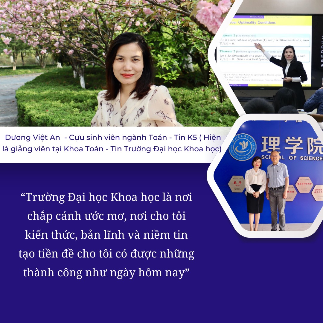 Dương Thị Việt An sinh ra và lớn lên tại một vùng nông thôn nghèo, nhưng bằng một nghị lực và khát khao cháy bỏng, cô học sinh đó đã chọn trường ĐHKH để học tập và rèn luyện và phát triển sự nghiệp. Với kết quả học tập xếp loại Giỏi sau 4 năm học, Việt An được giữ lại làm giảng viên tại Khoa Toán - Tin, trường ĐHKH. Tháng 8/2018, Dương Thị Việt An đã bảo vệ thành công luận án tiến sĩ Toán học ở tuổi 29. Đến nay, Việt An đã công bố 18 bài báo khoa học trên các tạp chí quốc tế uy tín thuộc danh mục ISI, Scopus.
