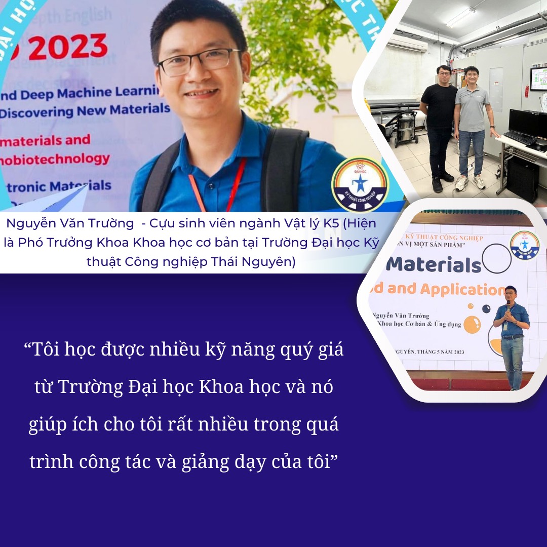 Nguyễn Văn Trường, cựu sinh viên ngành Vật lý khoá 3, là một thầy giáo vừa dạy giỏi lại vừa đam mê NCKH. Hiện nay, Nguyễn Văn Trường là tiến sĩ Vật lý và giữ chức vụ Phó Trưởng Khoa Khoa học Cơ bản tại Trường Đại học Kỹ thuật Công nghiệp – ĐH Thái Nguyên. Với nhiều năm kinh nghiệm trong giảng dạy và nghiên cứu, TS. Trường đã tích cực tham gia vào các dự án nghiên cứu khoa học, đồng thời truyền cảm hứng cho sinh viên qua những bài giảng chất lượng và thiết thực tại Trường Đại học Kỹ thuật Công nghiệp.