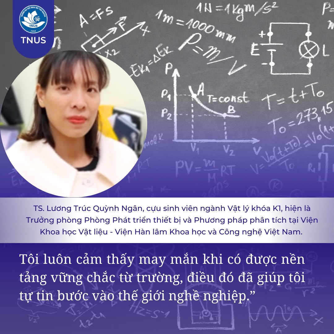 Có thể kể đến, TS. Lương Trúc Quỳnh Ngân, cựu sinh viên ngành Vật lý khóa K1, hiện là Trưởng phòng Phòng Phát triển thiết bị và Phương pháp phân tích tại Viện Khoa học Vật liệu - Viện Hàn lâm Khoa học và Công nghệ Việt Nam. Trong suốt thời gian học tập tại Trường, chị không chỉ chú trọng vào lý thuyết mà còn tích cực tham gia vào các dự án nghiên cứu thực tế. Chị đã có cơ hội làm việc trong các phòng thí nghiệm hiện đại, nơi chị được hướng dẫn bởi những giảng viên có kinh nghiệm. Sau khi tốt nghiệp, Quỳnh Ngân đã tiếp tục theo học chương trình sau đại học và nhanh chóng được nhận vào Viện Khoa học Vật liệu. Tại đây, với sự nỗ lực không ngừng, chị đã được thăng tiến lên vị trí Trưởng phòng, nơi chị dẫn dắt các dự án phát triển thiết bị và phương pháp phân tích. Chị chia sẻ: “Tôi luôn cảm thấy may mắn khi có được nền tảng vững chắc từ trường, điều đó đã giúp tôi tự tin bước vào thế giới nghề nghiệp.”