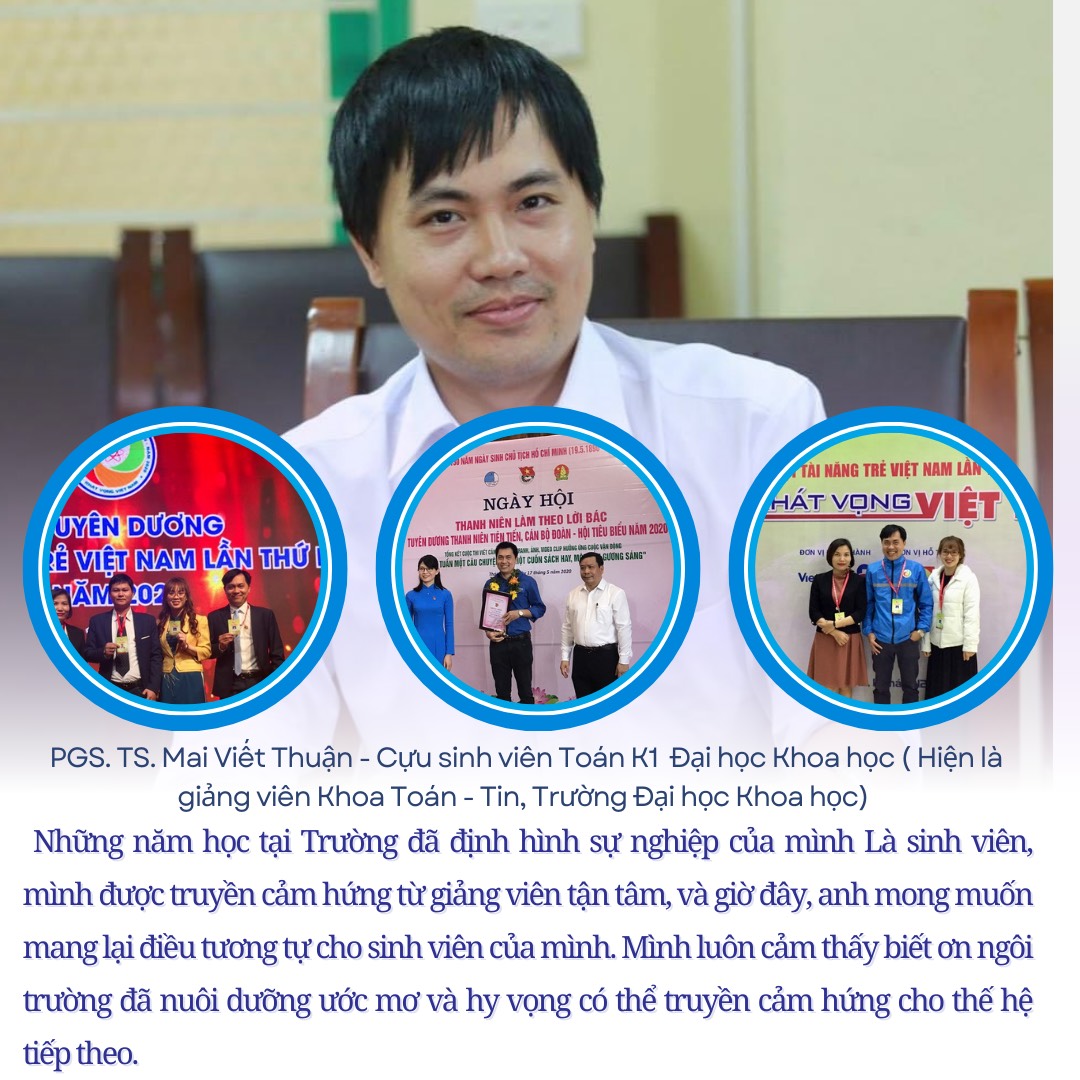 Mai Viết Thuận là một trong những thế hệ sinh viên đầu tiên nhập học tại Trường ĐHKH (Toán K1). Với niềm đam mê Toán học, Thuận đã quyết tâm và kiên trì con đường trở thành một giảng viên Đại học. Năm 2015, thầy Mai Viết Thuận đã bảo vệ thành công luận án tiến sĩ Toán học ở tuổi 30. Với thành tích NCKH vô cùng ấn tượng như: 03 lần được nhận thưởng “Công trình Toán học” các năm 2012, 2013 và 2015; đạt giải Nhì Tài năng Khoa học trẻ Việt Nam dành cho giảng viên trẻ dưới 35 tuổi; có trên 50 bài báo được công bố trên các tạp chí ISI/SCIE; hướng dẫn thành công nhiều nghiên cứu sinh, học viên SĐH và ĐH…Với những thành công đó, vô cùng vinh dự khi Mai Viết Thuận là cựu sinh viên đầu tiên của Trường ĐHKH được phong học hàm Phó Giáo sư (năm 2023) và hiện đang giữ chức vụ Phó Trưởng Khoa Toán - Tin.