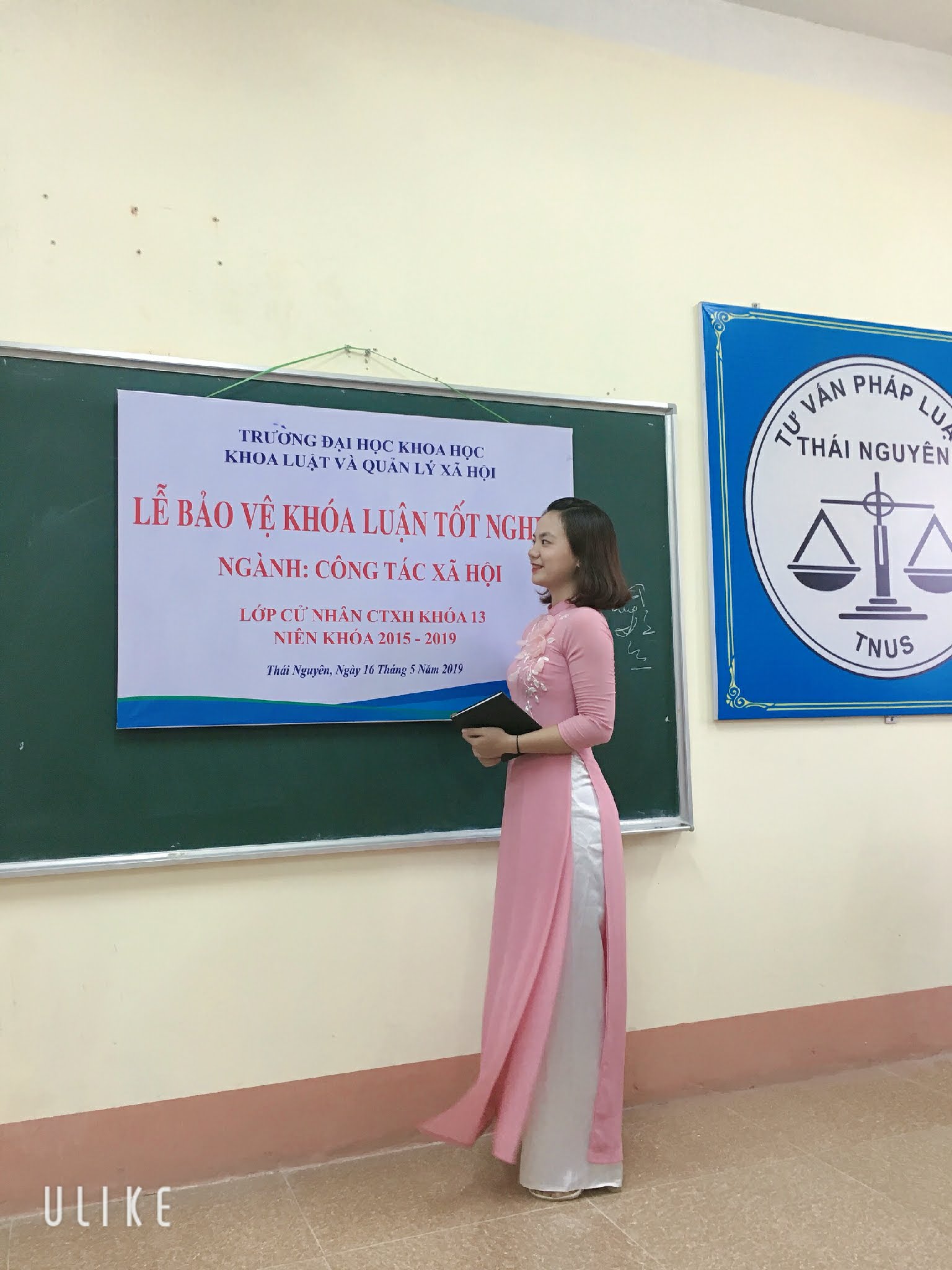 Từ những cố gắng nỗ lực và rèn luyện không ngừng của bản thân, từ những kiến thức, kinh nghiệm giá trị của thầy cô đã truyền đạt. Đến nay, khi đã ra trường và lập nghiệp tôi vẫn luôn tự hào vì đã chọn đúng ngành học Công tác xã hội - Trường Đại học Khoa học. Với những kiến thức và kỹ năng được lĩnh hội và trau dồi, hiện tại tôi là một Trị liệu viên hay nói cách khác là Giáo viên can thiệp trẻ đặc biệt – đây là một nghề đòi hỏi phải thật sự yêu nghề, kiên trì và có tâm mới có làm tốt được. Với công việc của mình hiện tại, tôi đã làm được điều mà mình mong muốn đó là sự: "Thấu hiểu - Yêu thương - Chia sẻ", đã thực hiện được những mục tiêu khi lựa chọn theo học đại học.