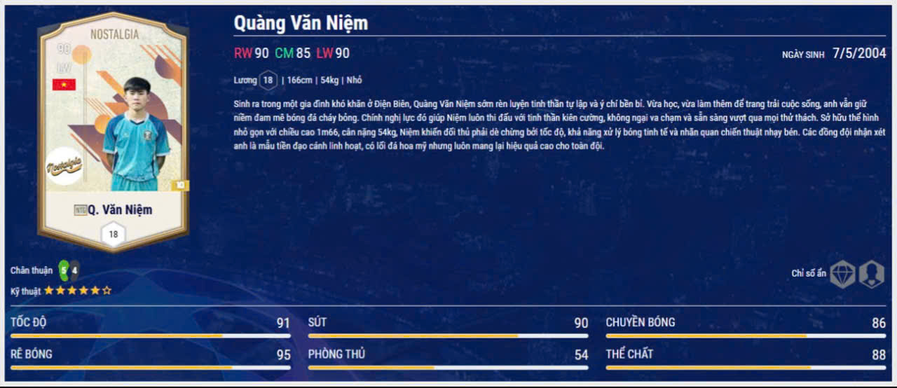 Sở hữu thể hình nhỏ gọn với chiều cao 1m66, cân nặng 54kg, nhưng Quàng Văn Niệm khiến đối thủ phải dè chừng bởi tốc độ, khả năng xử lý bóng tinh tế cùng nhãn quan chiến thuật nhạy bén. Các đồng đội ví Niệm là “đôi chân ma thuật bên hành lang cánh của TNUS”, một tiền đạo cánh linh hoạt, có lối chơi hoa mỹ nhưng mang hiệu quả cao cho toàn đội.