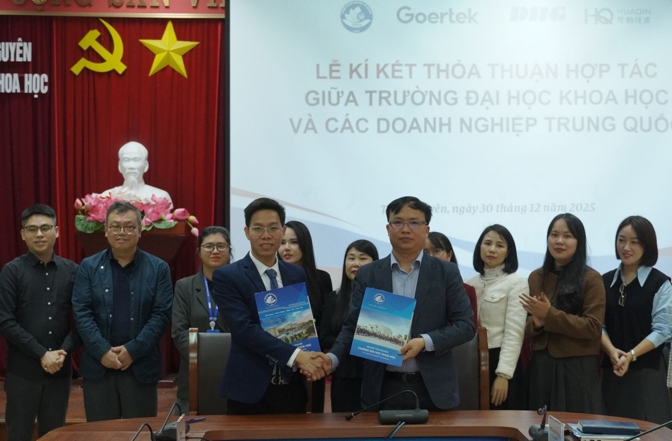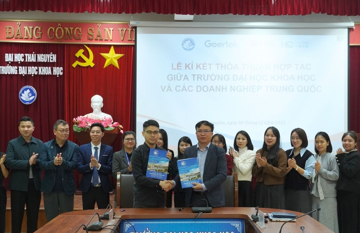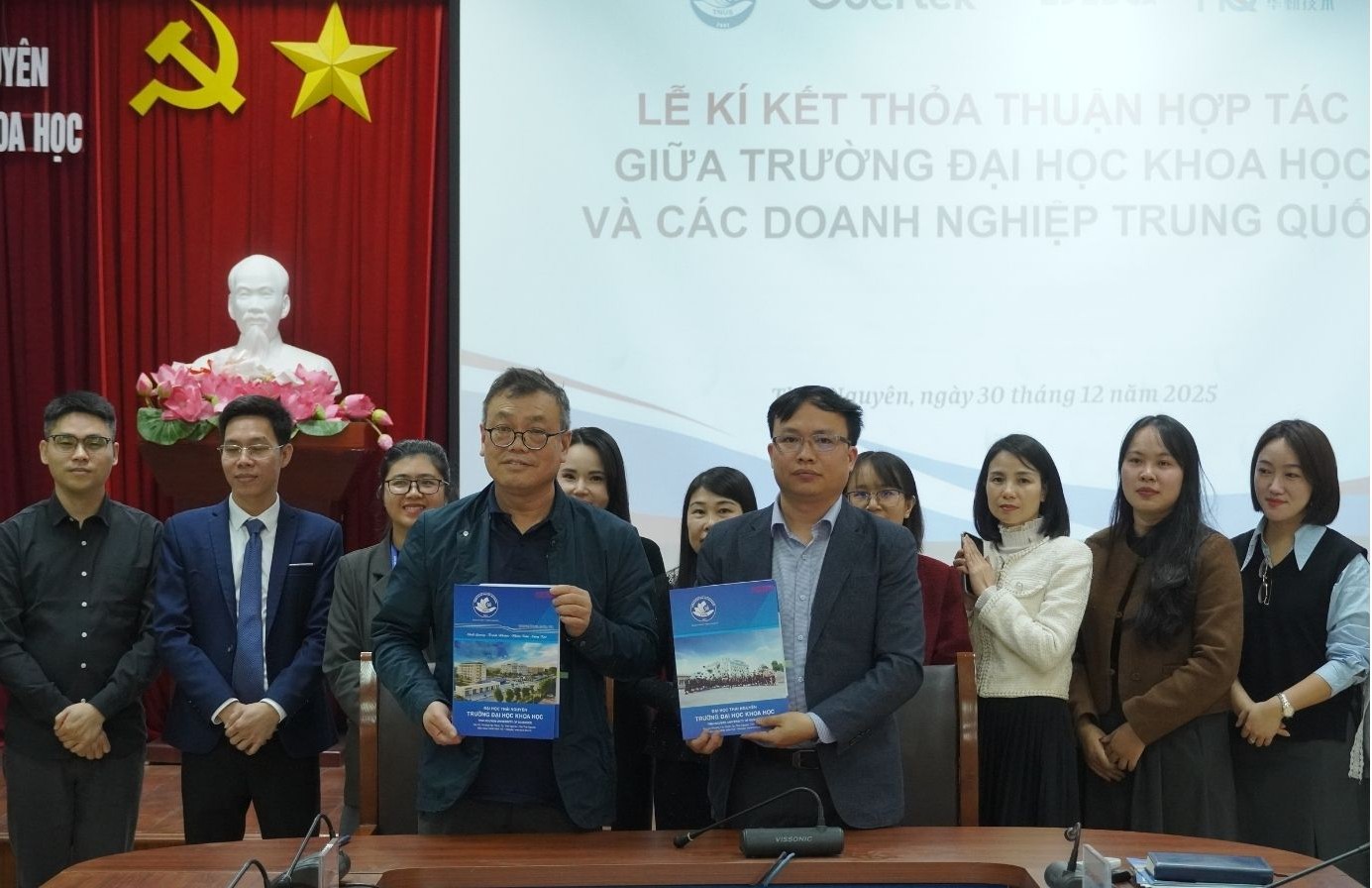 Sáng ngày 30/12/2025, tại Trường Đại học Khoa học (Đại học Thái Nguyên) đã long trọng tổ chức Lễ ký kết thỏa thuận hợp tác giữa Trường Đại học Khoa học và các doanh nghiệp Trung Quốc, nhằm tăng cường mối quan hệ hợp tác giữa nhà trường và doanh nghiệp, đồng thời mở rộng cơ hội thực tập, việc làm cho sinh viên.
