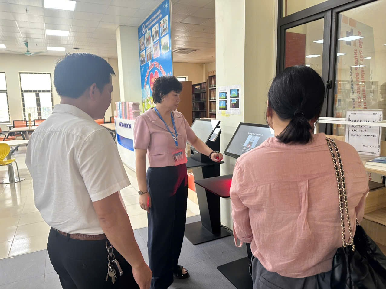 Đoàn tham quan được tìm hiểu hệ thống tra cứu mượn trả sách tự động