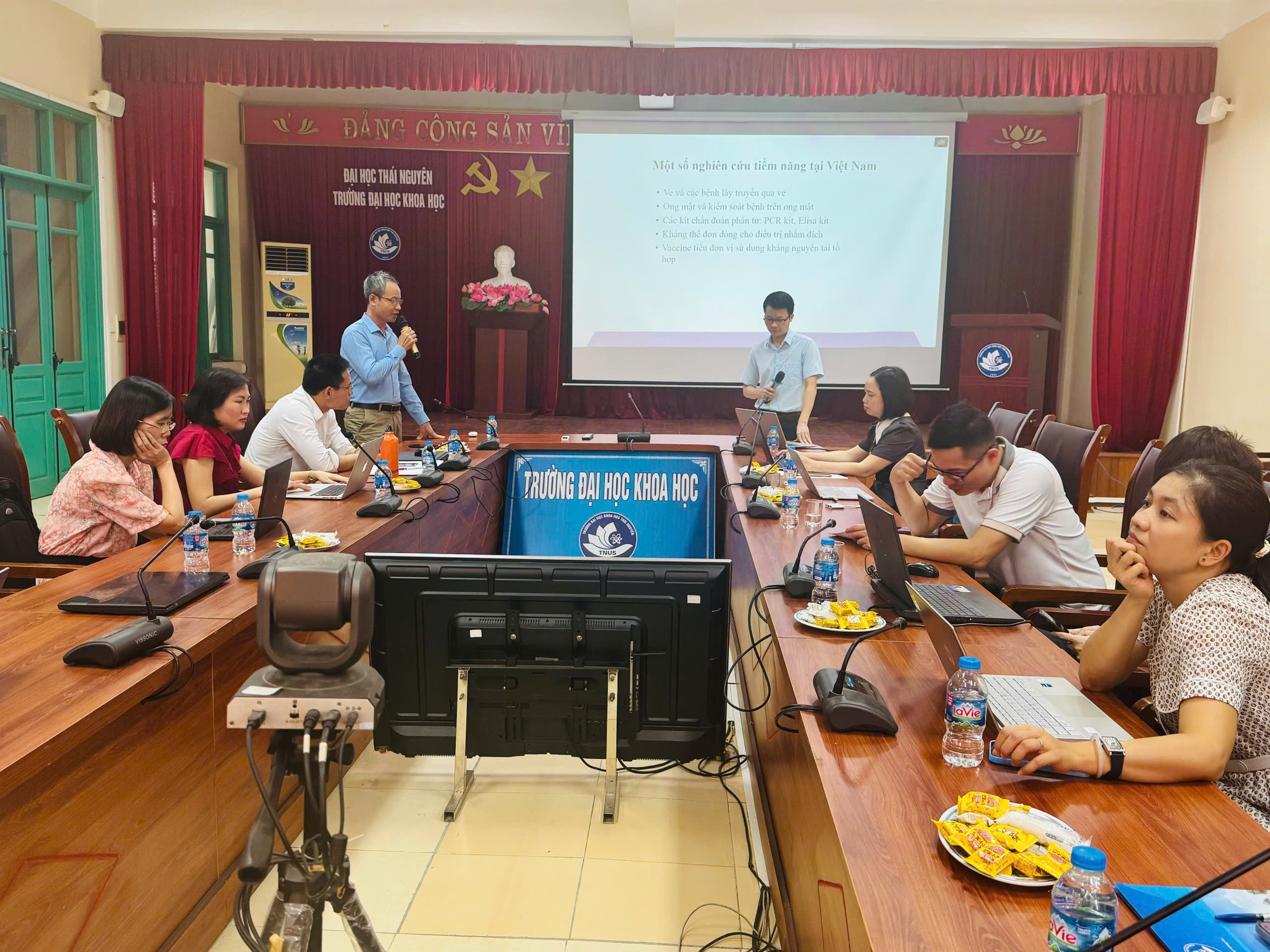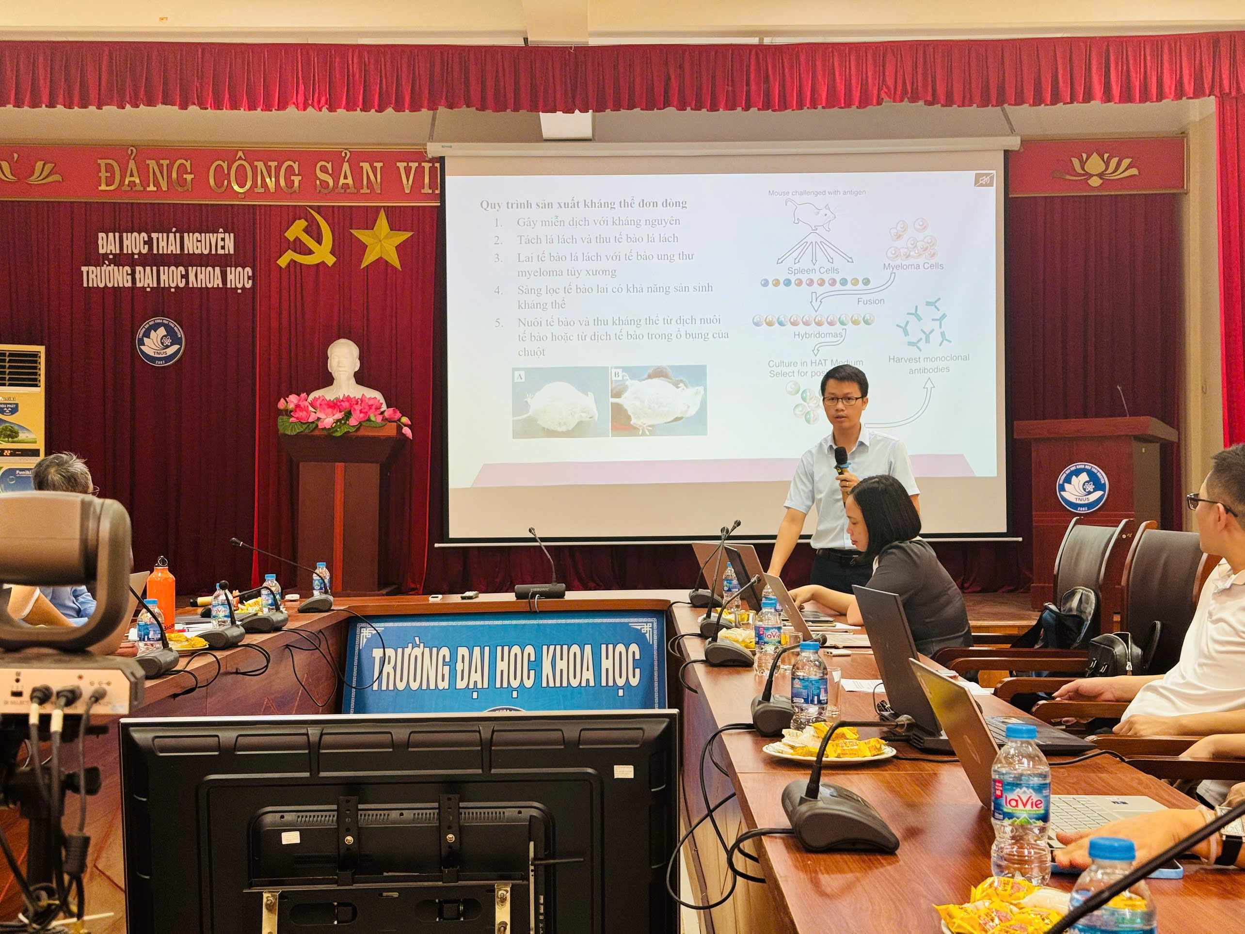 TS. Trưởng A Tài (Trưởng bộ môn Công nghệ Sinh học) mở đầu chương trình với báo cáo “Phát triển các phương pháp phân tử ứng dụng trong chẩn đoán và điều trị bệnh truyền nhiễm trên động vật và người”. Báo cáo nhấn mạnh tiềm năng của các công nghệ sinh học phân tử như PCR, LAMP, CRISPR trong việc phát hiện và điều trị sớm các bệnh truyền nhiễm nguy hiểm.
