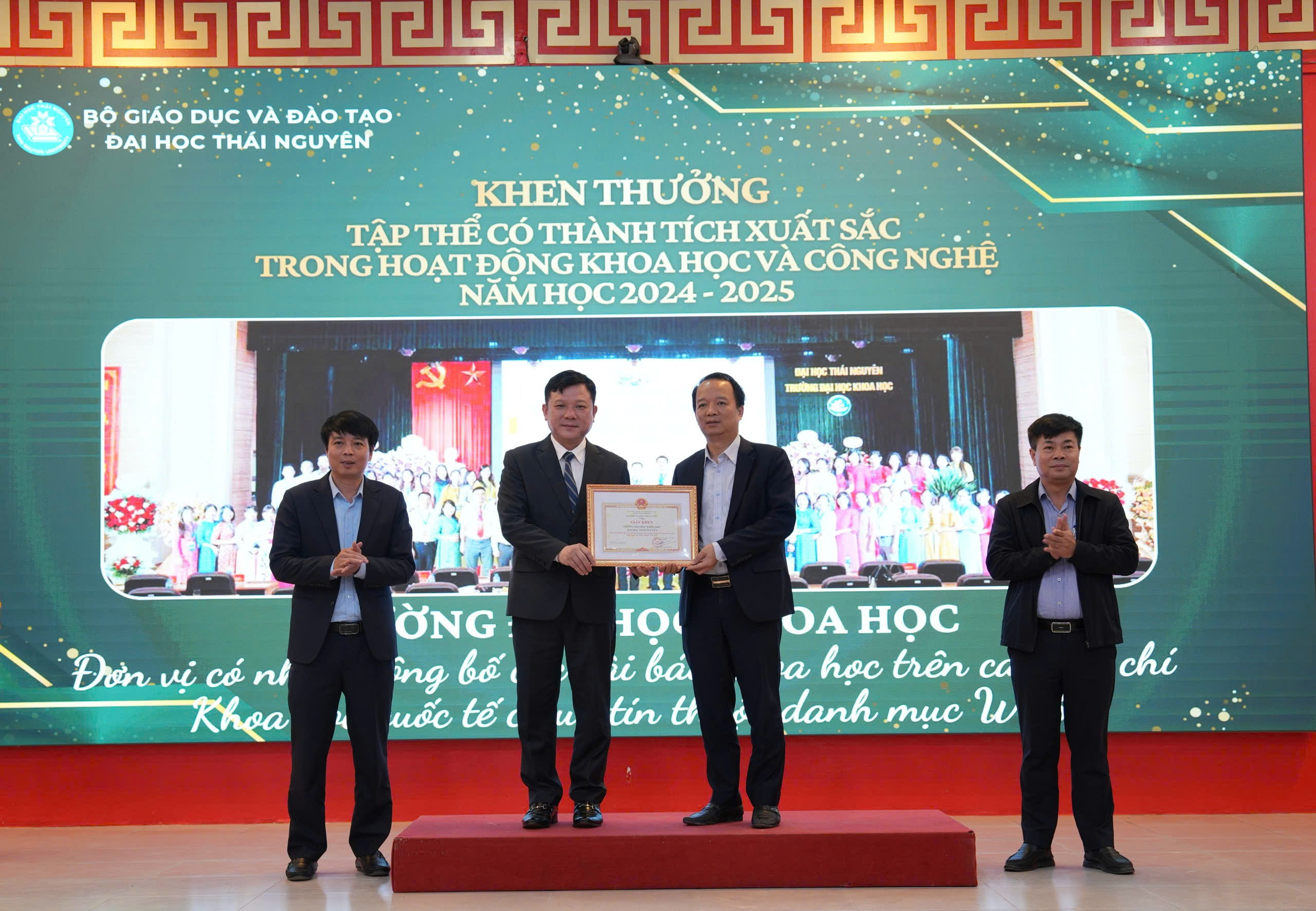 Ba tập thể được vinh danh bao gồm: Trường Đại học Khoa học (Đơn vị có nhiều công bố các bài báo khoa học trên các tạp chí Khoa học quốc tế có uy tín thuộc danh mục WOS năm học 2024 - 2025), Trường Đại học Sư phạm (Đơn vị có nhiều thành tích trong hoạt động nghiên cứu khoa học của sinh viên và giảng viên trẻ) và Trường Đại học Nông lâm (Đơn vị có nhiều Bằng độc quyền giải pháp hữu ích). PGS.TS Ngô Văn Giới - Phó Bí thư Đảng ủy, Chủ tịch Hội đồng trường - thay mặt Nhà trường nhận phần thưởng cao quý từ đồng chí Giám đốc ĐH Thái Nguyên.