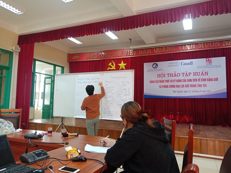 Ngày 23/01/2021, TS. Tạ Thị Thảo – Phó trưởng Khoa KHXH&NV và bà Ngô Thị Thu Hà – Giám đốc CEPEW đã trực tiếp điều hành thảo luận, tập huấn giúp sinh viên hiểu về bình đẳng giới thực chất và bạo lực trên cơ sở giới trong tình yêu sinh viên (Bạo lưc hẹn hò).