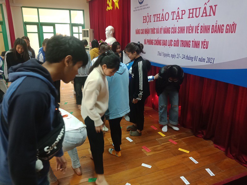 Chùm ảnh về thực hành kỹ năng giao tiếp phi bạo lực và xây dựng giải pháp ứng phó với bạo lực giới trong tình yêu sinh viên.
