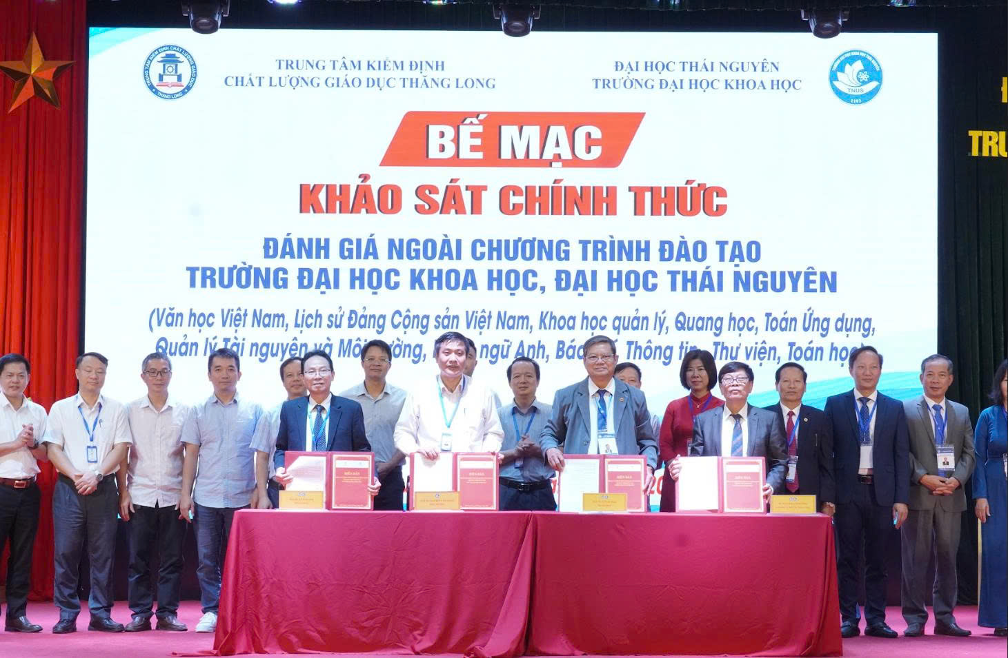 Kết thúc phiên bế mạc, đại diện lãnh đạo Trường Đại học Khoa học, Trưởng Đoàn Đánh giá ngoài và đại diện lãnh đạo Trung tâm KĐCLGD Thăng Long đã ký kết biên bản hoàn thành đợt khảo sát chính thức 10 CTĐT của Nhà trường.