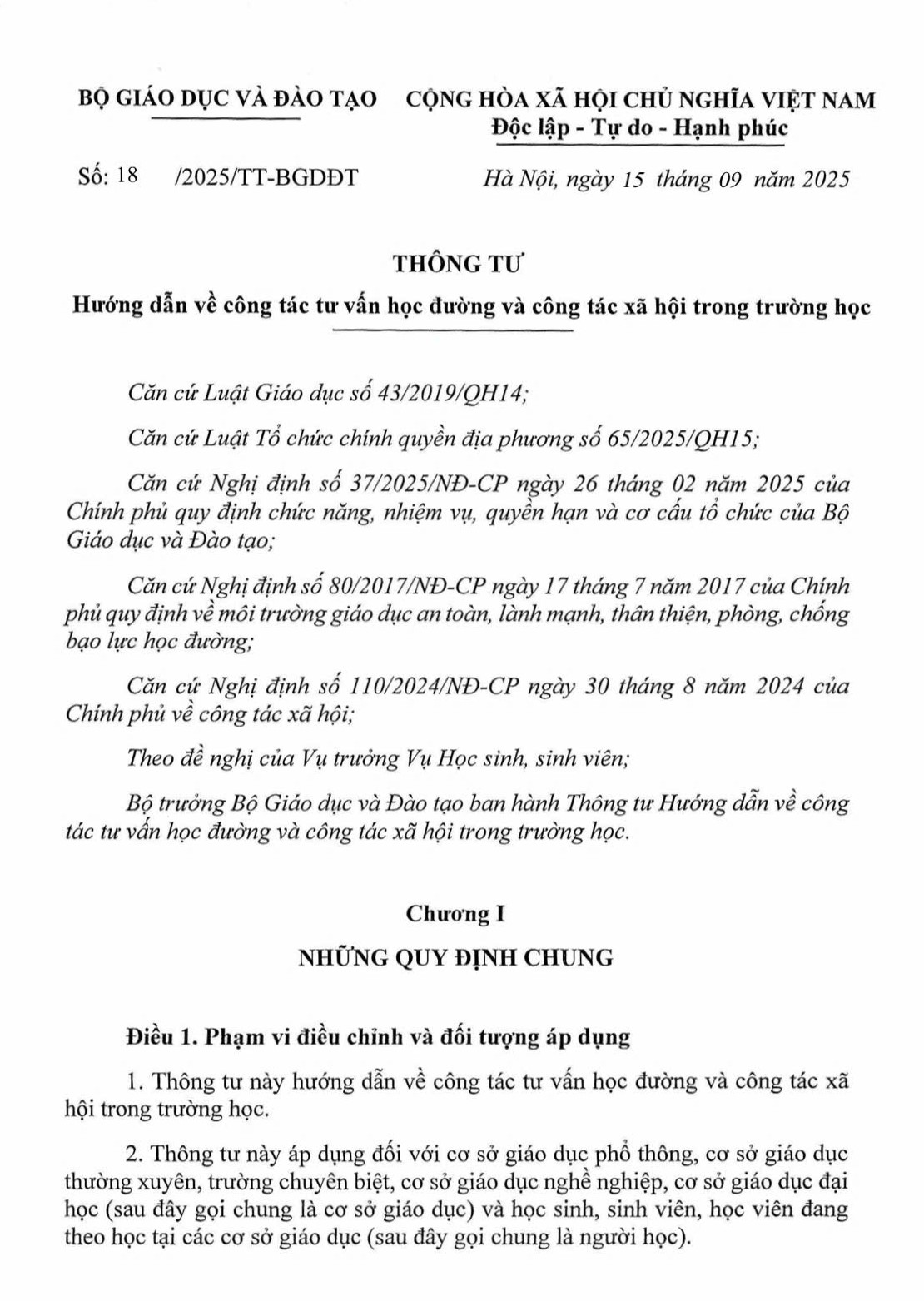 Trong xu thế đổi mới căn bản và toàn diện nền giáo dục Việt Nam, việc chăm lo đến sự phát triển toàn diện của người học không chỉ giới hạn ở tri thức, mà còn bao gồm đời sống tinh thần, tâm lý, kỹ năng xã hội và định hướng giá trị sống. Đáp ứng yêu cầu này, ngày 15/9/2025, Bộ Giáo dục và Đào tạo đã ban hành Thông tư số 18/2025/TT-BGDĐT hướng dẫn chi tiết về công tác tư vấn học đường và công tác xã hội trong trường học. Theo đó, Thông tư áp dụng cho mọi cấp cơ sở giáo dục: phổ thông, giáo dục thường xuyên, trường chuyên biệt, giáo dục nghề nghiệp, đại học và cho cả học sinh, sinh viên, học viên.