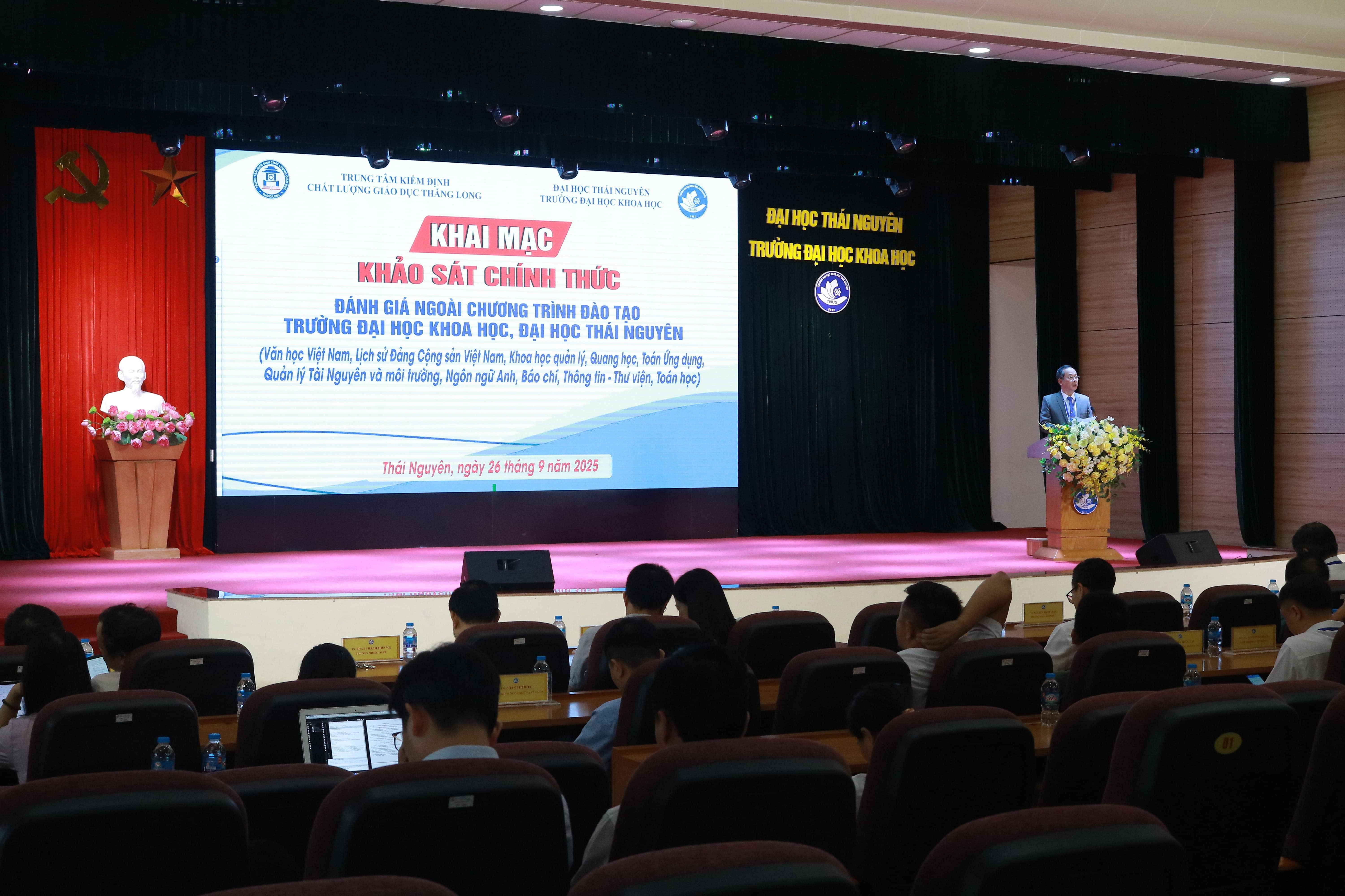 Sáng ngày 26/09, Trường Đại học Khoa học phối hợp với Trung tâm Kiểm định chất lượng giáo dục (KĐCLGD) Thăng Long tổ chức Khai mạc đợt khảo sát chính thức đánh giá ngoài (ĐGN) 10 chương trình đào tạo của Trường Đại học Khoa học theo tiêu chuẩn của Bộ Giáo dục và Đào tạo ban hành. Các CTĐT được đánh giá lần này gồm 04 CTĐT bậc Đại học (Ngôn ngữ Anh, Báo chí, Thông tin – Thư viện, Toán học) và 06 CTĐT bậc Thạc sĩ (Văn học Việt Nam, Lịch sử Đảng Cộng sản Việt Nam, Khoa học quản lý, Quang học, Toán Ứng dụng, Quản lý Tài nguyên và Môi trường).
