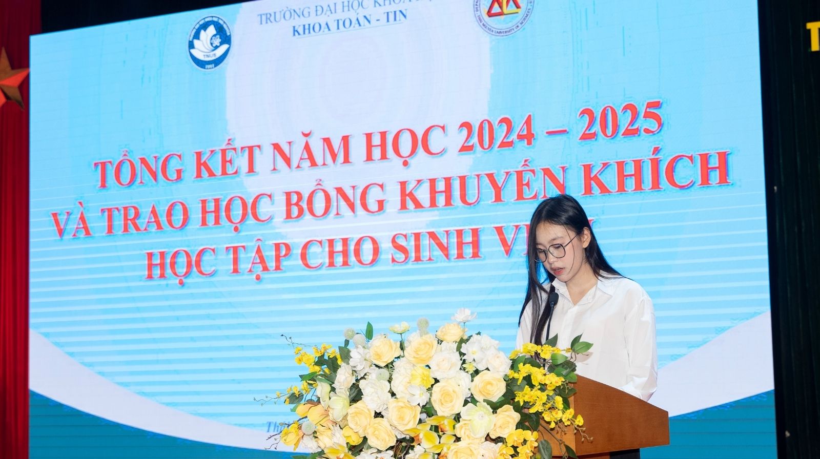 Tiếp đó, ThS. Hoàng Hoài Nam, Giảng viên Khoa Toán – Tin đã tổng kết công tác học sinh – sinh viên năm học 2024 – 2025, một năm ghi nhận nhiều thành tích nổi bật của tập thể Khoa Toán – Tin: nhiều sinh viên đã nhận Học bổng Khuyến khích học tập của Trường; nhiều tập thể lớp đạt danh hiệu thi đua; đặc biệt có sinh viên nhận được Học bổng của Viện Nghiên cứu Cao cấp về Toán – một giải thưởng uy tín trong lĩnh vực khoa học cơ bản. Ngoài những thành tích về học thuật, sinh viên của Khoa còn tích cực tham gia và đạt được những kết quả tốt trong các phong trào hoạt động của Đoàn Thanh niên và Hội Sinh viên, thể hiện tinh thần năng động của tuổi trẻ.
