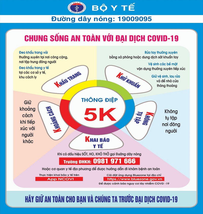 Hãy thực hiện Thông điệp 5K: “Khẩu trang – Khử khuẩn – Khoảng cách – Không tập trung – Khai báo y tế" để giữ an toàn cho CBVCNLĐ và người học Trường Đại học Khoa học trước đại dịch COVID-19!