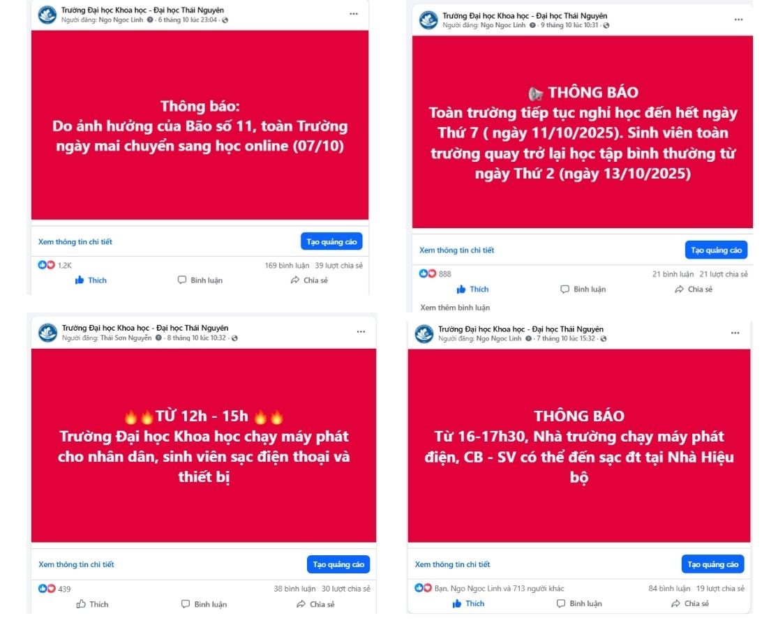 Tối ngày 7/10, ngay khi nắm bắt được diễn biến bất thường của mưa lũ trên địa bàn Tỉnh Thái Nguyên, Ban Chỉ đạo Phòng cháy chữa cháy và cứu nạn cứu hộ (PCCC&CNCH) Trường ngay lập tức triển khai các công tác ứng phó thiên tai. Nhà trường đã ban hành các văn bản chỉ đạo khẩn cấp, kích hoạt phương án phòng, chống thiên tai trên toàn trường. Thông tin cảnh báo, hướng dẫn phòng tránh của các cấp được chuyển tải nhanh chóng qua nhiều kênh như: Email, Zalo, Facebook, điện thoại, tin nhắn… giúp cán bộ, sinh viên chủ động bảo vệ bản thân và tài sản.