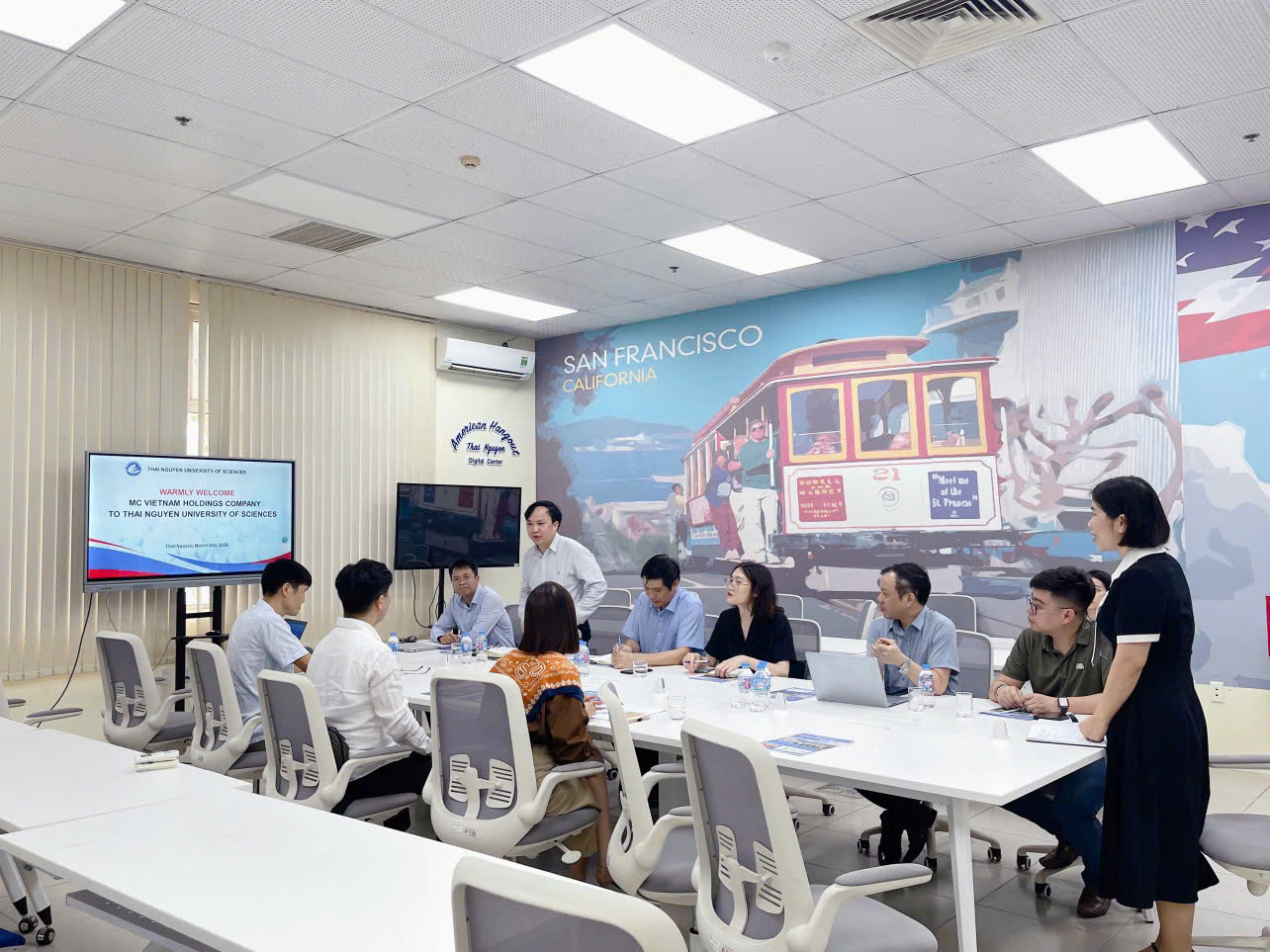 Chiều ngày 31/03/2026, tại Thái Nguyên, Trường Đại học Khoa học - Đại học Thái Nguyên đã có buổi giao lưu kết nối với Công ty MC Vietnam Holdings nhằm thảo luận về cơ hội hợp tác đa lĩnh vực. Buổi làm việc không chỉ mang ý nghĩa tăng cường quan hệ giữa Nhà trường và doanh nghiệp, mà còn mở ra hướng tiếp cận mới trong hợp tác quốc tế, đặc biệt ở lĩnh vực công nghệ ứng dụng và kết nối đào tạo với nhu cầu thực tiễn. Theo định hướng được trao đổi, MC Vietnam Holdings là đơn vị có thế mạnh kết nối, có mạng lưới quan hệ với doanh nghiệp và các cơ sở giáo dục tại Hàn Quốc, từ đó có thể hỗ trợ Trường Đại học Khoa học mở rộng tiếp cận đối tác Hàn Quốc, cập nhật công nghệ mới và thúc đẩy khả năng ứng dụng vào đào tạo.
