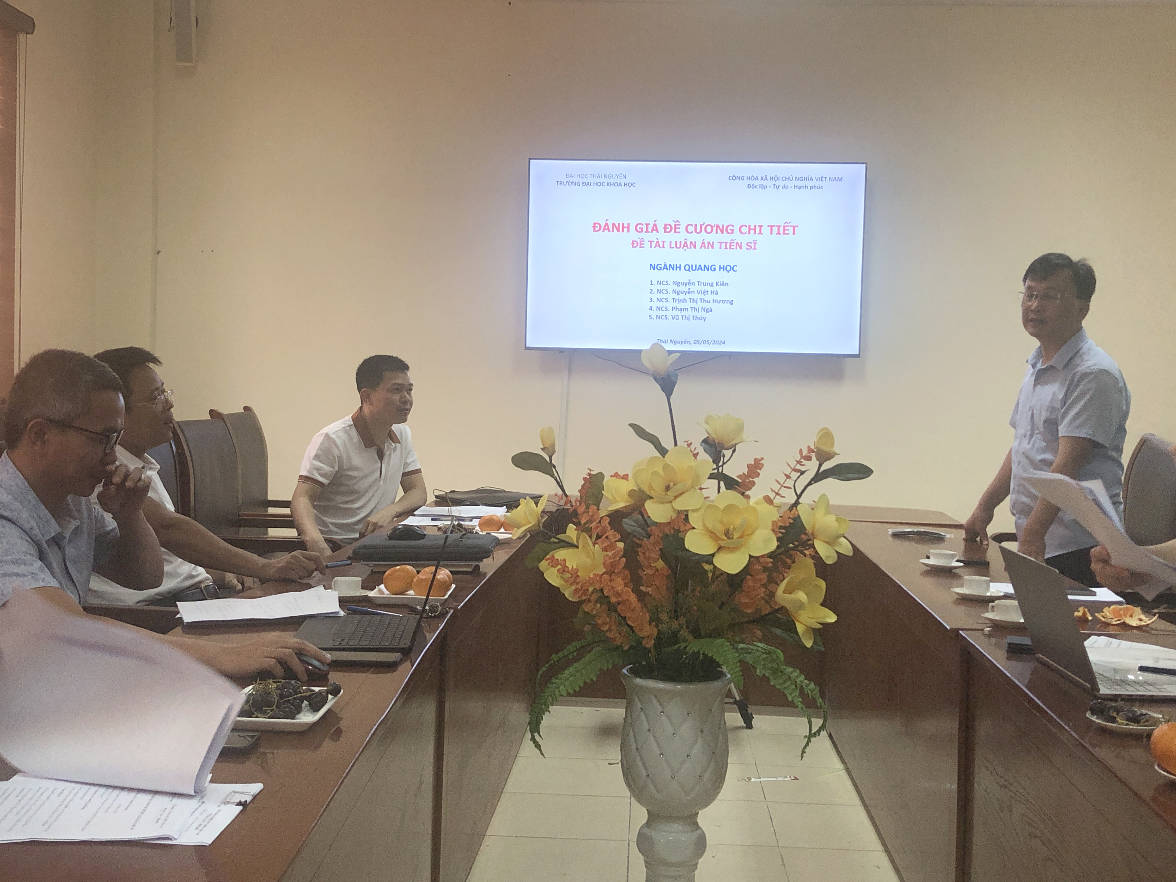Sáng ngày 05/5/2024, Trường Đại học Khoa học - Đại học Thái Nguyên tổ chức họp Hội đồng đánh giá đề cương chi tiết đề tài Luận án cho các Nghiên cứu sinh: Nguyễn Trung Kiên, Nguyễn Việt Hà, Trịnh Thị Thu Hương, Phạm Thị Ngà, Vũ Thị Thúy thuộc ngành đào tạo: Quang học, mã số: 9440110