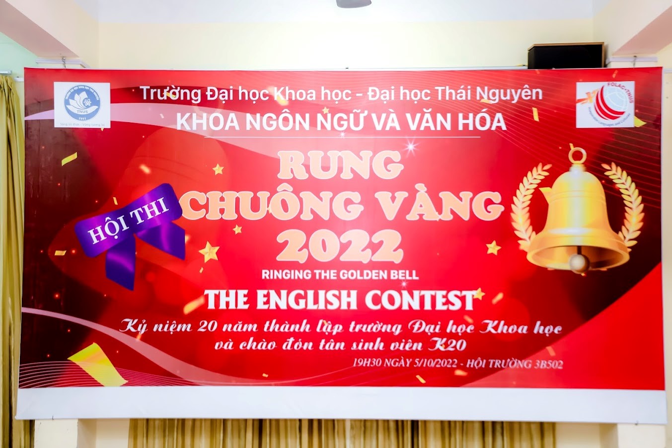 Hòa cùng không khí tưng bừng, phấn khởi của công tác chuẩn bị một chuỗi các sự kiện lớn nhân dịp Trường Đại học Khoa học Thái Nguyên tròn 20 năm tuổi, đồng thời để chào mừng các bạn tân sinh viên K20 nhập trường, Khoa Ngôn ngữ và Văn hóa đã long trọng tổ chức Hội thi Rung chuông vàng 2022 vào lúc 19 giờ 00 phút, ngày 05 tháng 10 năm 2022 tại khán phòng 502, giảng đường 3B của Trường Đại học Khoa học Thái Nguyên.