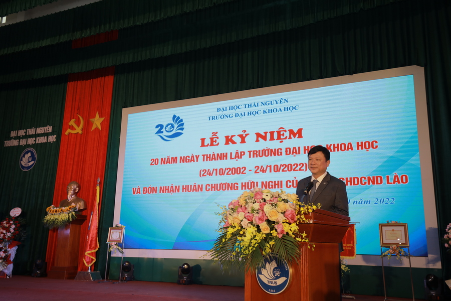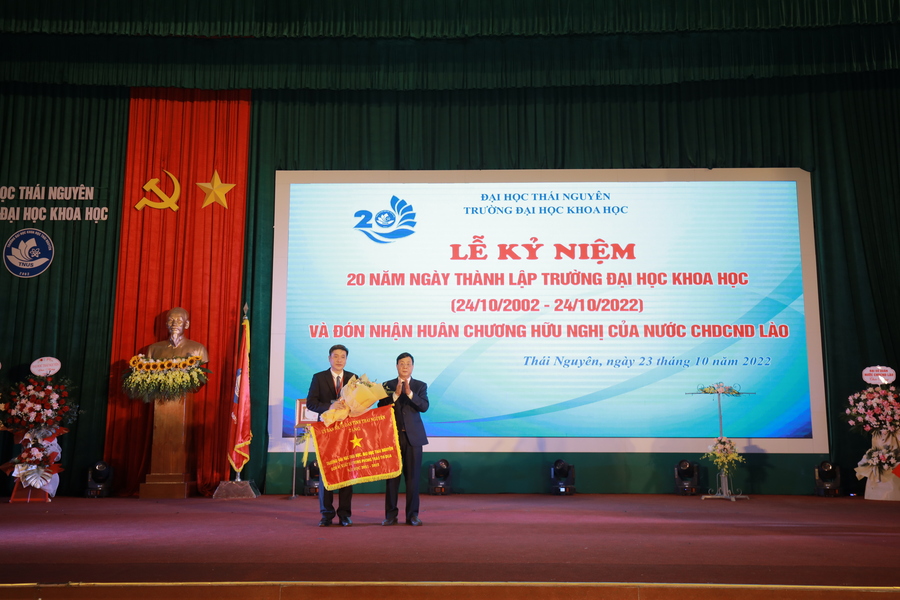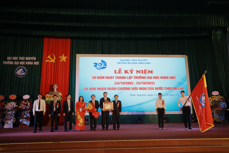 Ngày 23/10, Trường Đại học Khoa học – Đại học Thái Nguyên đã long trọng tổ chức lễ kỷ niệm 20 năm thành lập Trường Đại học Khoa học (24/10/2002 – 24/10/2022) và đón nhận Huân chương Hữu nghị của nước CHDCND Lào. Dự buổi lễ có Ngài Chan-tha-phone KHAM-MA-NI-CHANH, Tham tán, Phó Đại sứ quán nước Cộng hòa Dân chủ nhân dân Lào tại Việt Nam; đồng chí Đặng Xuân Trường – Uỷ viên Ban Thường vụ Tỉnh uỷ, Phó Chủ tịch thường trực UBND tỉnh Thái Nguyên; GS.TS. Lê Thị Thanh Nhàn – Vụ trưởng Vụ Giáo dục Dân tộc – Bộ Giáo dục và Đào tạo, nguyên Hiệu trưởng Nhà trường; Ông Vũ Thanh Bình - Phó Vụ trưởng Vụ Khoa học, Công nghệ và Môi trường; Ông Phạm Như Nghệ - Phó Vụ trưởng Vụ Giáo dục Đại học; Bà Đặng Thị Oanh - Phó Cục trưởng Cục Công nghệ thông tin; PGS.TS Hoàng Văn Hùng – Giám đốc Đại học Thái Nguyên, đại diện lãnh đạo các Sở, Ban, ngành của tỉnh, các cơ quan, đơn vị, đối tác có quan hệ hợp tác với nhà trường; lãnh đạo Văn phòng, các ban chức năng, các trường đại học thành viên, đơn vị trực thuộc Đại học Thái Nguyên cùng toàn thể cán bộ, viên chức, người lao động, các thế hệ sinh viên, học viên, nghiên cứu sinh của Trường Đại học Khoa học.
