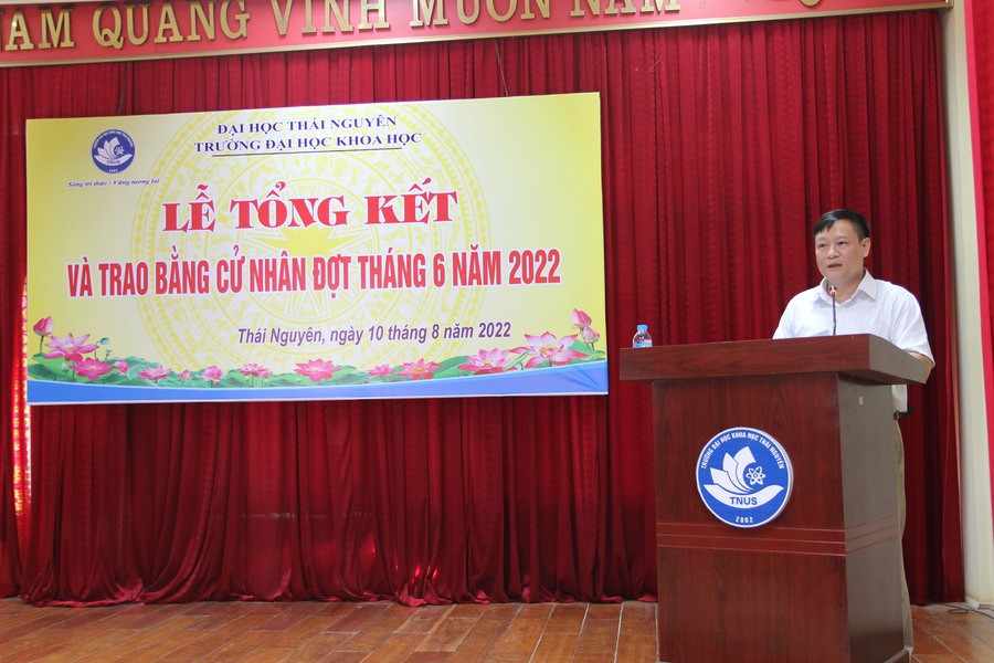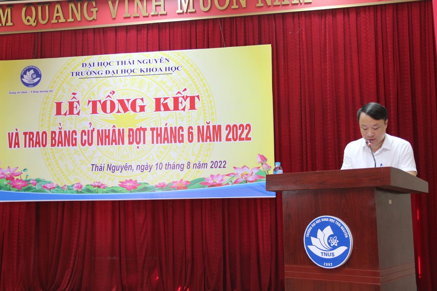 Mở đầu buổi lễ, TS. Kiều Quốc Lập – Phó Trưởng phòng Đào tạo đã trình bày báo cáo tổng kết công tác đào tạo niên khóa 2018 – 2022. Trong đợt tốt nghiệp này, các sinh viên đã trở thành tân cử nhân khoa học thuộc các ngành: Luật học, Quản trị dịch vụ Du lịch và Lữ hành, Công tác xã hội, Báo chí, Ngôn ngữ Anh, Công nghệ Kỹ thuật Hóa học, Hóa Dược. Trong đó có 03 sinh viên tốt nghiệp loại “Xuất sắc”, 25 sinh viên tốt nghiệp loại “Giỏi”. Bên cạnh việc nỗ lực học tập, nhiều bạn SV khóa 16 đã thực hiện các đề tài nghiên cứu khoa học của mình với sự giúp đỡ tận tình của các giảng viên giỏi về chuyên môn, nhiệt huyết trong nghiên cứu khoa học. Khóa 16 đã có 35 đề tài nghiên cứu khoa học được thực hiện, trong đó có nhiều đề tài có chất lượng rất tốt. Đặc biệt, có 4 đề tài đã đạt giải thưởng SV NCKH toàn quốc,… Các tân cử nhân tốt nghiệp tại TNUS sẽ là nguồn nhân lực có kiến thức chuyên môn tốt, kỹ năng tác nghiệp và khả năng thích ứng linh hoạt, đáp ứng nhu cầu xã hội.