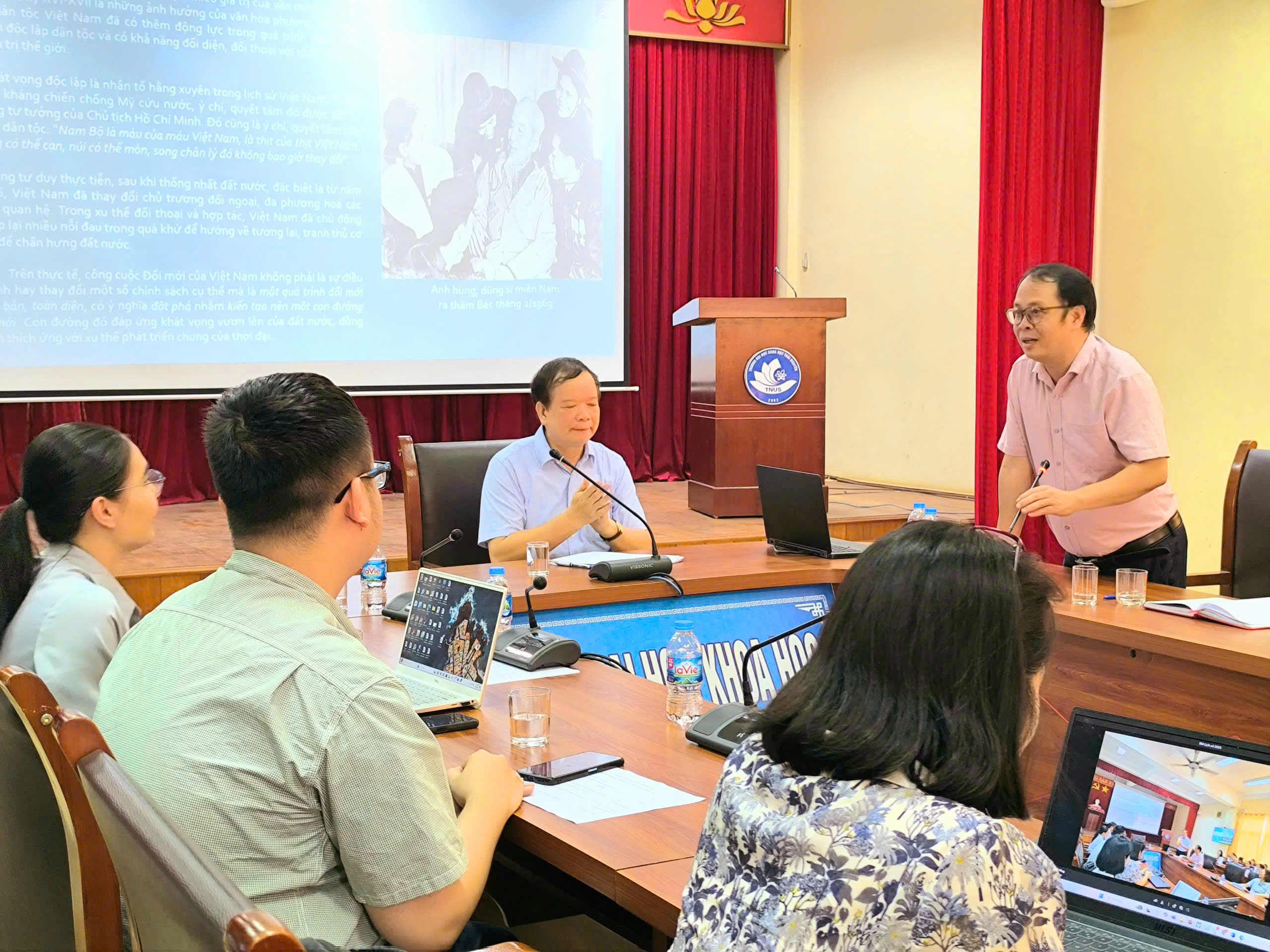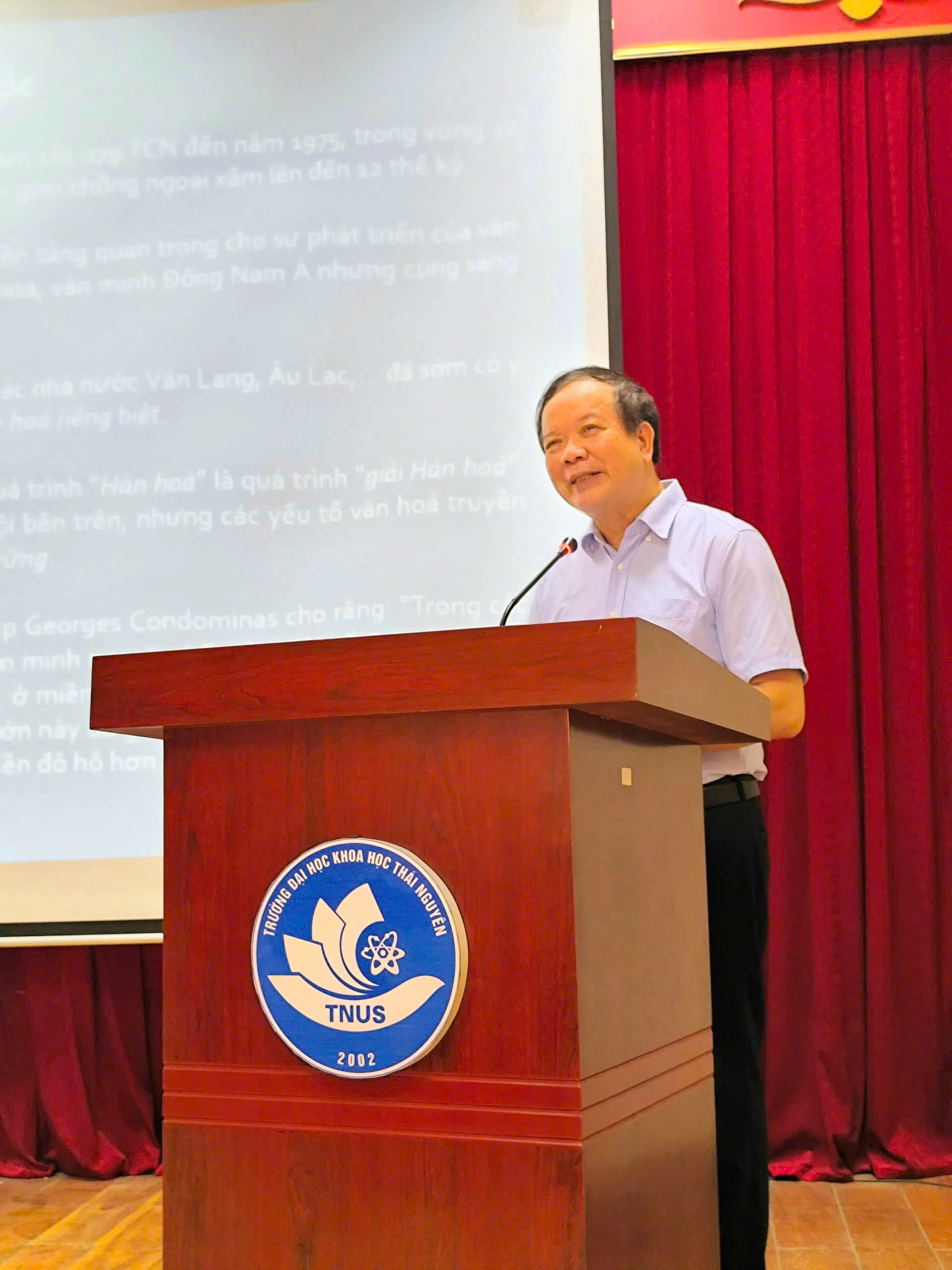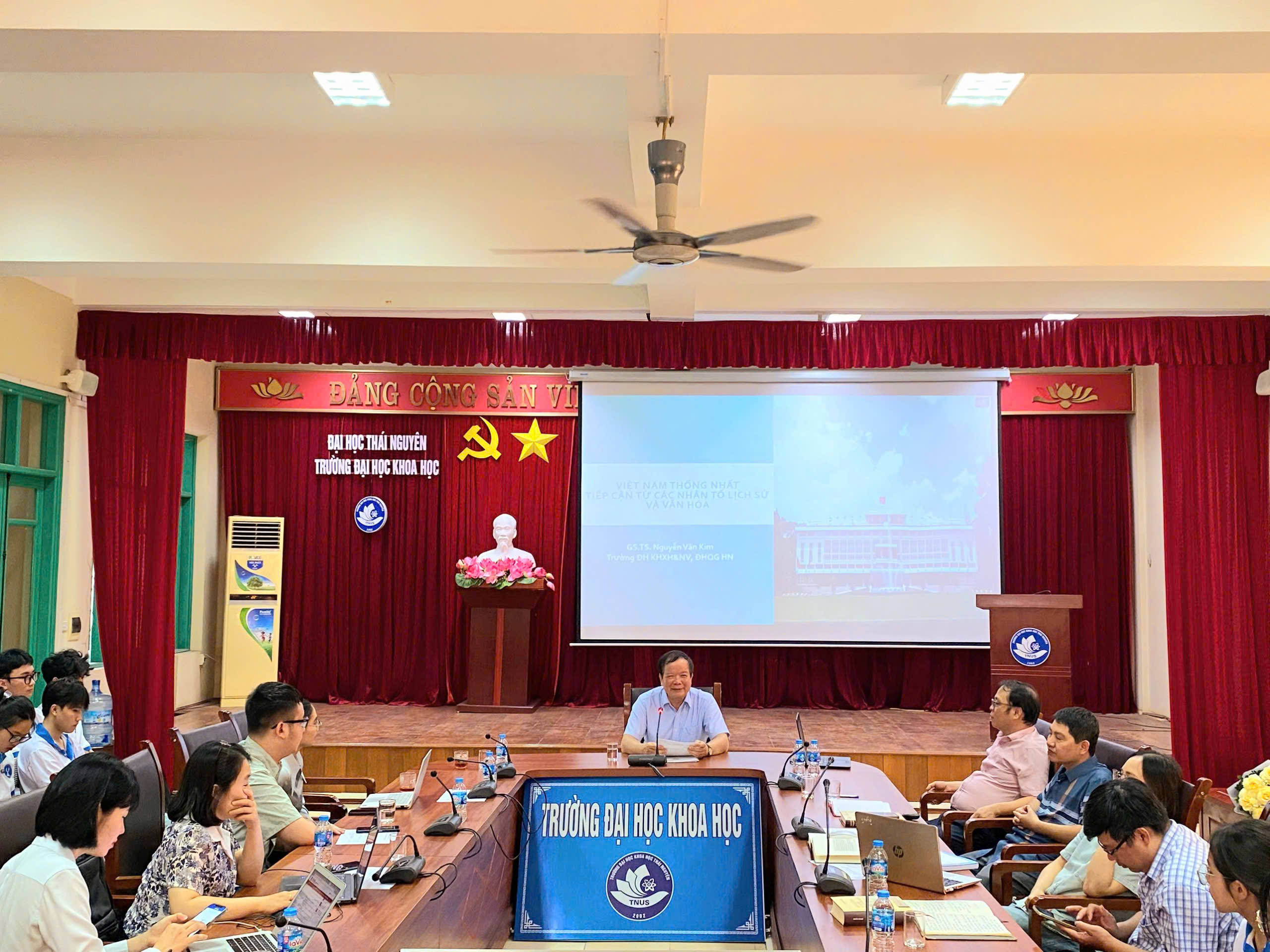 Ngày 14/05/2025, Bộ môn Lịch sử - Khoa Khoa học Xã hội và Nhân văn - Trường Đại học Khoa học tổ chức chương trình bồi dưỡng chuyên đề “Việt Nam thống nhất: Tiếp cận từ các nhân tố lịch sử và văn hóa” do GS.TS Nguyễn Văn Kim làm diễn giả. Đây là một trong những hoạt động chuyên môn thường xuyên của Khoa KHXH&NV, nhằm cập nhật, bổ sung kịp thời các kiến thức, kĩ năng cần thiết cho đội ngũ giảng viên, học viên cao học và sinh viên trong công tác giảng dạy, nghiên cứu, học tập.