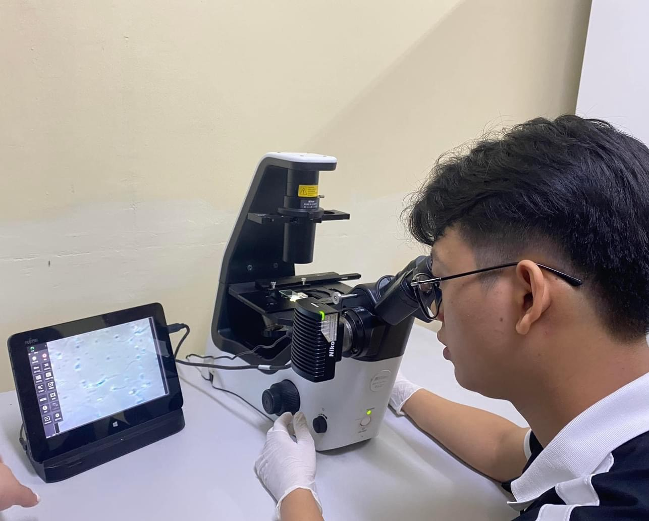 Sinh viên thực hành xét nghiệm phân mảnh tinh trùng (xét nghiệm chất lượng tinh trùng) trên hệ thống máy đếm dòng chảy tế bào