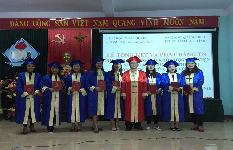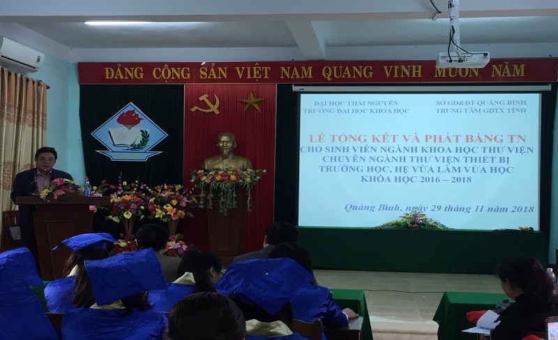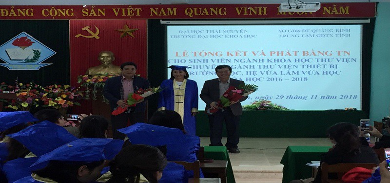 Ngày 29/11/2018, tại Hội trường TTGDTX tỉnh Quảng Bình, trường Đại học Khoa học đã phối hợp cùng đơn vị liên kết trang trọng tổ chức Lễ bế giảng và trao bằng Cử nhân cho các học viên theo học hệ VLVH, ngành Khoa học Thư viện.