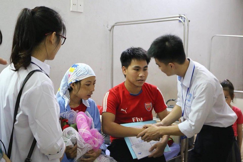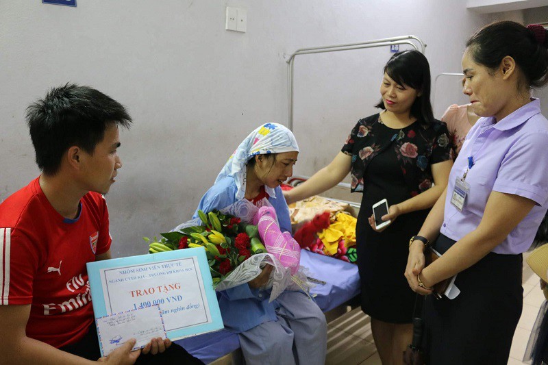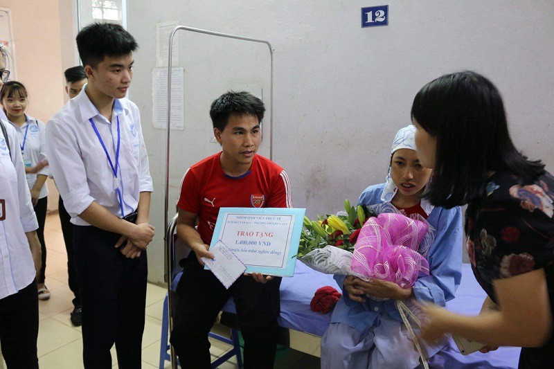 Cuối buổi tổng kết, lãnh đạo phòng CTXH và CSSKCĐ, các giảng viên bộ môn CTXH và đại diện sinh viên thực hành đã đến phòng bệnh trao số tiền gây quỹ được cho bệnh nhân có hoàn cảnh đặc biệt khó khăn. Số tiền của nhóm sinh viên gây quỹ được với mục đích hỗ trợ bệnh nhân Lý Minh Hiếu, tuy nhiên bệnh nhân Hiếu đã được các tổ chức, cá nhân, các nhà hảo tâm chia sẻ và sau khi phẫu thuật đã qua giai đoạn nguy kịch, đang ở giai đoạn phục hồi. Do đó, phòng CTXH và CSSKSCĐ đã góp ý với nhóm sinh viên có thể suy nghĩ và chia sẻ sự ủng hộ cho một bệnh nhân khác cũng đang rất cần sự hỗ trợ. Trước hoàn cảnh của bệnh nhân Dậu (người dân tộc Mông, xã Xuân Lạc, huyện Chợ Đồn, tỉnh Bắc Kạn) phát hiện K vòm họng trong quá trình mang thai và sinh nở, sức khỏe suy giảm nghiêm trọng, là người dân tộc thiểu số, không có điều kiện khám và chữa bệnh. Nhóm sinh viên đã quyết định chuyển khoản tiền đã gây quỹ được cho chị với quan điểm đều là sự chia sẻ một phần rất nhỏ vật chất cho những bệnh nhân khó khăn, mong muốn mọi bệnh nhân đều cần có được sự chung tay giúp đỡ để phục hồi sức khỏe tìm lại niềm vui trong cuộc sống.