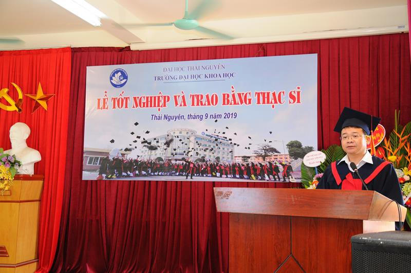 Phát biểu tại buổi Lễ, PGS.TS. Nguyễn Văn Đăng đã nhiệt liệt chúc mừng và gửi tặng bó hoa tươi thắm chúc mừng 115 tân Thạc sĩ. PGS.TS. Nguyễn Văn Đăng đánh giá cao tinh thần ham học hỏi, sự chịu khó, tính kỷ luật và thái độ học tập nghiêm túc, cần mẫn, của các tân Thạc sĩ. Phó Giáo sư mong rằng dù ở cương vị nào các tân Thạc sĩ hãy cố gắng phấn đấu để luôn xứng đáng với học vị cao quý được nhận. Trường Đại học Khoa học sẽ luôn là địa chỉ tin cậy, sẵn sàng chào đón các tân Thạc sĩ quay trở lại tham gia các khóa học ở bậc đào tạo cao hơn. Nhân dịp này, PGS.TS. Nguyễn Văn Đăng cũng gửi lời trân trọng cảm ơn sự quan tâm chỉ đạo, tạo điều kiện thuận lợi đối với Nhà trường của Bộ Giáo dục & Đào tạo và Đại học Thái Nguyên, đặc biệt gửi lời cảm ơn sâu sắc tới các Giáo sư đầu ngành, các nhà khoa học tại các Viện nghiên cứu, các trường đại học uy tín trong cả nước đã sát cánh cùng Nhà trường trong giảng dạy và hướng dẫn nghiên cứu khoa học, góp phần quan trọng trong công tác đào tạo sau đại học của Nhà trường.