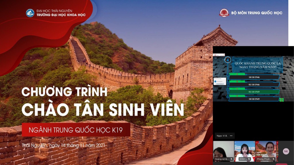 Ngày 14/11, Bộ môn Trung Quốc học, Trường Đại học Khoa học long trọng tổ chức chương trình “Chào tân sinh viên K19 ngành Trung Quốc học năm học 2021 - 2022” qua hình thức trực tuyến trên ứng dụng Micrsoft Teams.
