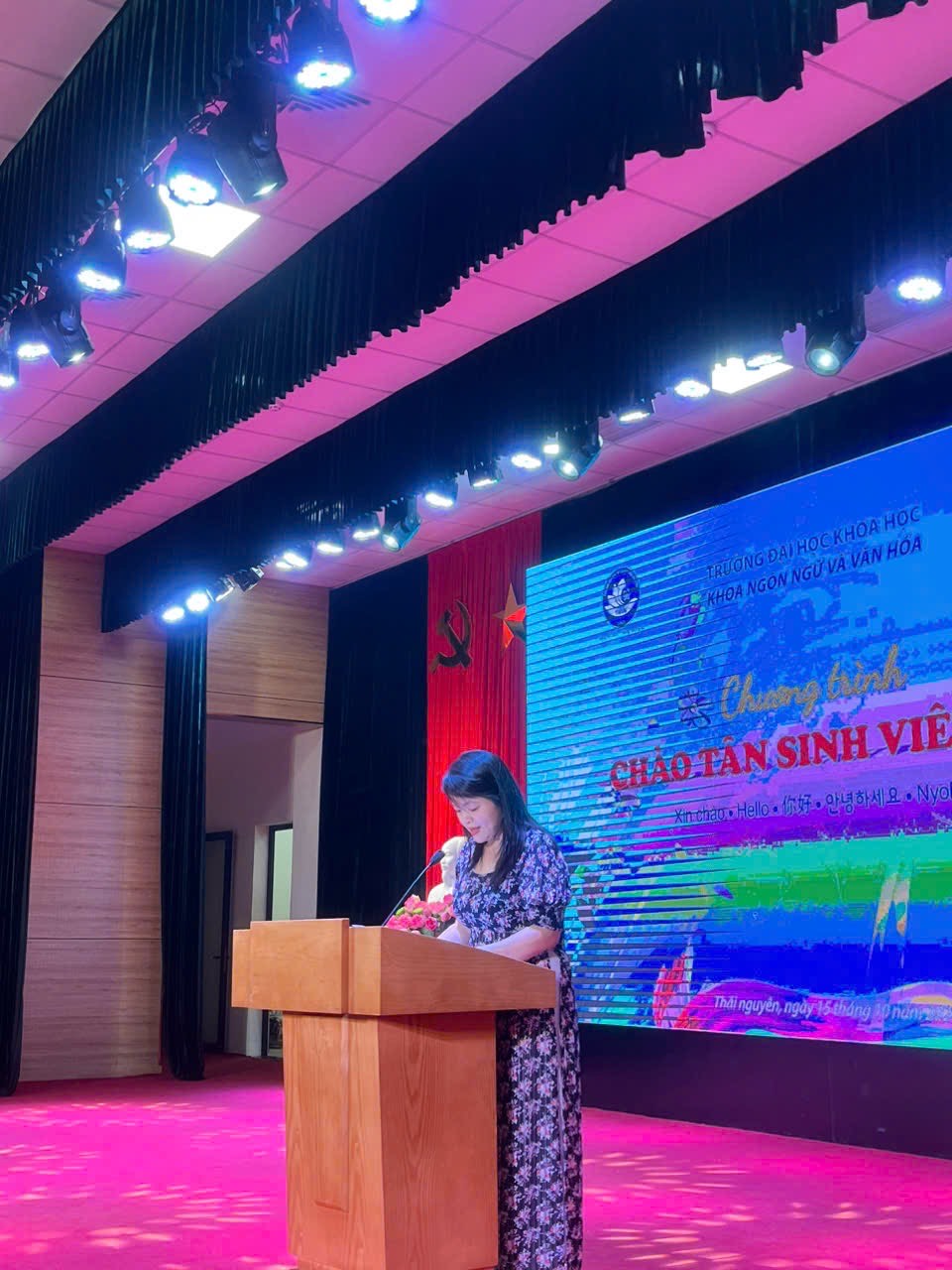 Phát biểu chúc mừng tại chương trình, TS. Phan Thị Hoà - Phó Trưởng khoa NN&VH gửi lời chúc mừng tới các Tân sinh viên khoá 22 mới nhập học thành công tại Trường. Bên cạnh phần giới thiệu tổng quan về Trường, về Khoa, cô còn chia sẻ về chương trình học tập, về phương pháp học tập, về định hướng nghề nghiệp và những vấn đề cần lưu tâm trong quá trình học tập tại Trường. Đó là những chia sẻ hết sức gần gũi, chân thành, đong đầy tâm huyết và tình yêu của cô với các Tân sinh viên khoá 22.