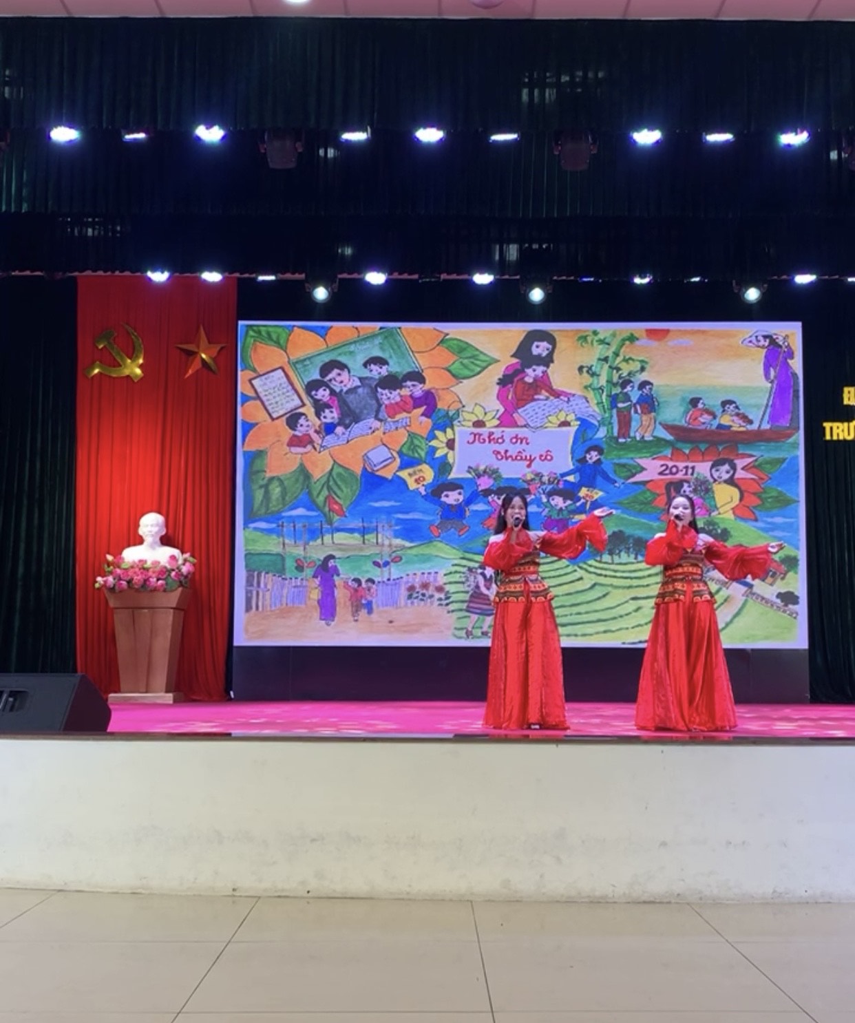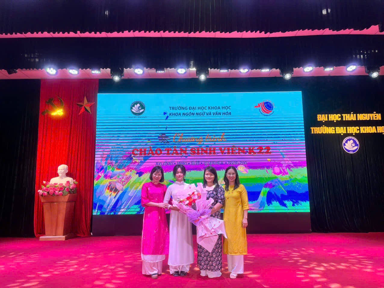 Đại diện Tân sinh viên K22, bạn Nguyễn Thị Vân Anh (lớp Song ngữ Anh Trung K22) đã phát biểu cảm tưởng và gửi tặng bó hoa tươi thắm đến các thầy cô trong Khoa. Thay mặt tập thể giảng viên, cô Phan Thị Hoà - Phó Trưởng Khoa, cô Nguyễn Diệu Linh - Phó Trưởng Bộ môn Ngữ văn & VHVN, cô Nguyễn Thị Quế - Trưởng Bộ môn Tiếng Anh đã lên đón nhận tình cảm của các bạn Tân sinh viên.