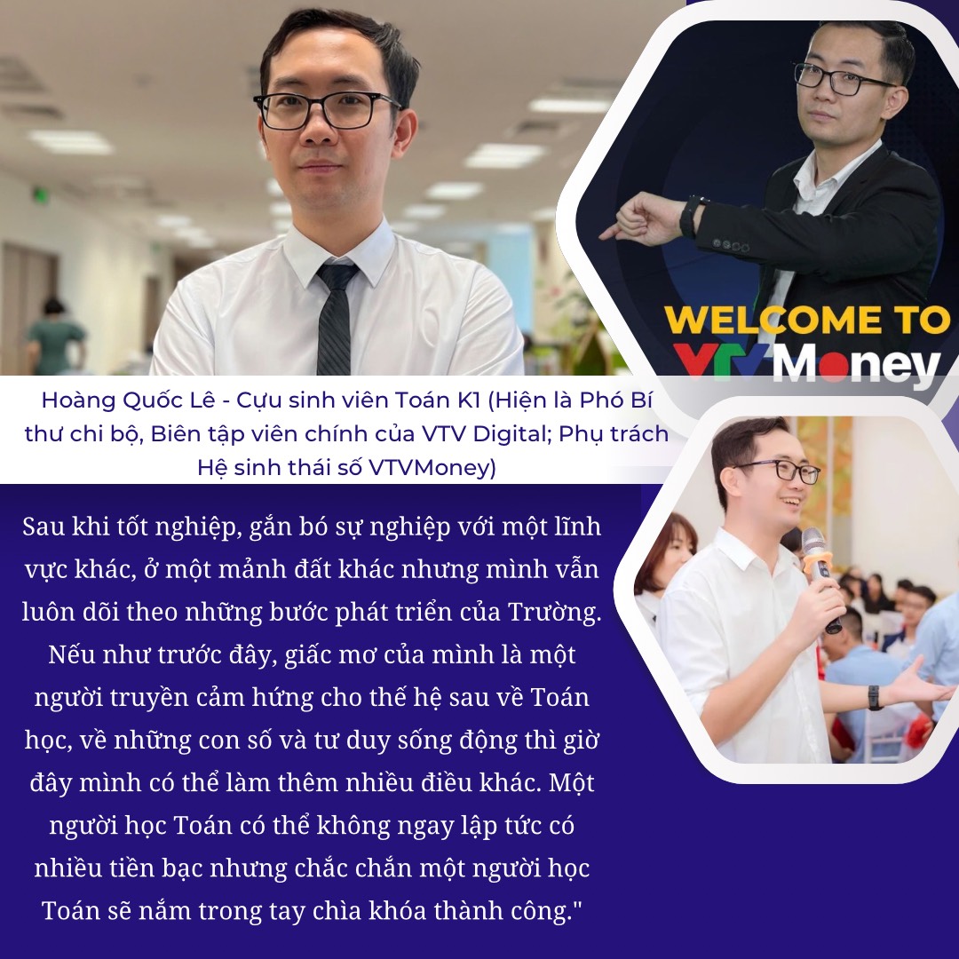 Được biết, hiện nay Hoàng Quốc Lê đang công tác tại VTVDigital - Trung tâm Sản xuất và Phát triển nội dung số với vai trò là Phó Bí thư chi bộ, Biên tập viên chính của VTV Digital; Phụ trách Hệ sinh thái số VTVMoney. Hoàng Quốc Lê chia sẻ: "Sau khi tốt nghiệp, gắn bó sự nghiệp với một lĩnh vực khác, ở một mảnh đất khác nhưng mình vẫn luôn dõi theo những bước phát triển của Trường. Nếu như trước đây, giấc mơ của mình là một người truyền cảm hứng cho thế hệ sau về Toán học, về những con số và tư duy sống động thì giờ đây mình có thể làm thêm nhiều điều khác. Nếu có dịp, mình sẽ sẵn sàng chia sẻ với sinh viên ngành Toán học và Toán - Tin ứng dụng về tuổi trẻ, ước mơ và những con đường khác nhau để thành công. Mình cũng có thể truyền cảm hứng cho sinh viên ngành báo chí về kinh nghiệm, về nghề, về thế giới đang vận động và giúp các em có những cơ hội mới cho tương lai. Một người học Toán có thể không ngay lập tức có nhiều tiền bạc nhưng chắc chắn một người học Toán sẽ nắm trong tay chìa khóa thành công."