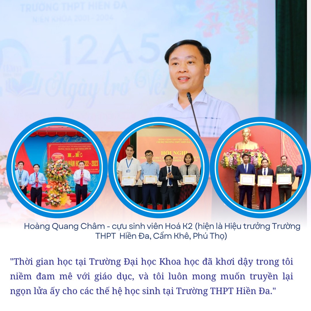 Hoàng Quang Châm, cựu sinh viên Hóa K2 của Trường ĐHKH, hiện đang giữ vị trí Hiệu trưởng tại Trường THPT Hiền Đa, Cẩm Khê, Phú Thọ, một ngôi trường có truyền thống bề dày lịch sử. Trong quá trình công tác, Châm đã ghi dấu ấn với nhiều thành tích nổi bật trong việc nâng cao chất lượng giáo dục. Dưới sự lãnh đạo của Quang Châm, Trường THPT Hiền Đa đã đạt được nhiều thành tích xuất sắc trong các kỳ thi học sinh giỏi cấp tỉnh và quốc gia. Nhiều học sinh của trường đã giành giải cao trong các cuộc thi Olympic môn Hóa học, cũng như các cuộc thi khoa học kỹ thuật, khẳng định vị thế của trường trong khu vực.