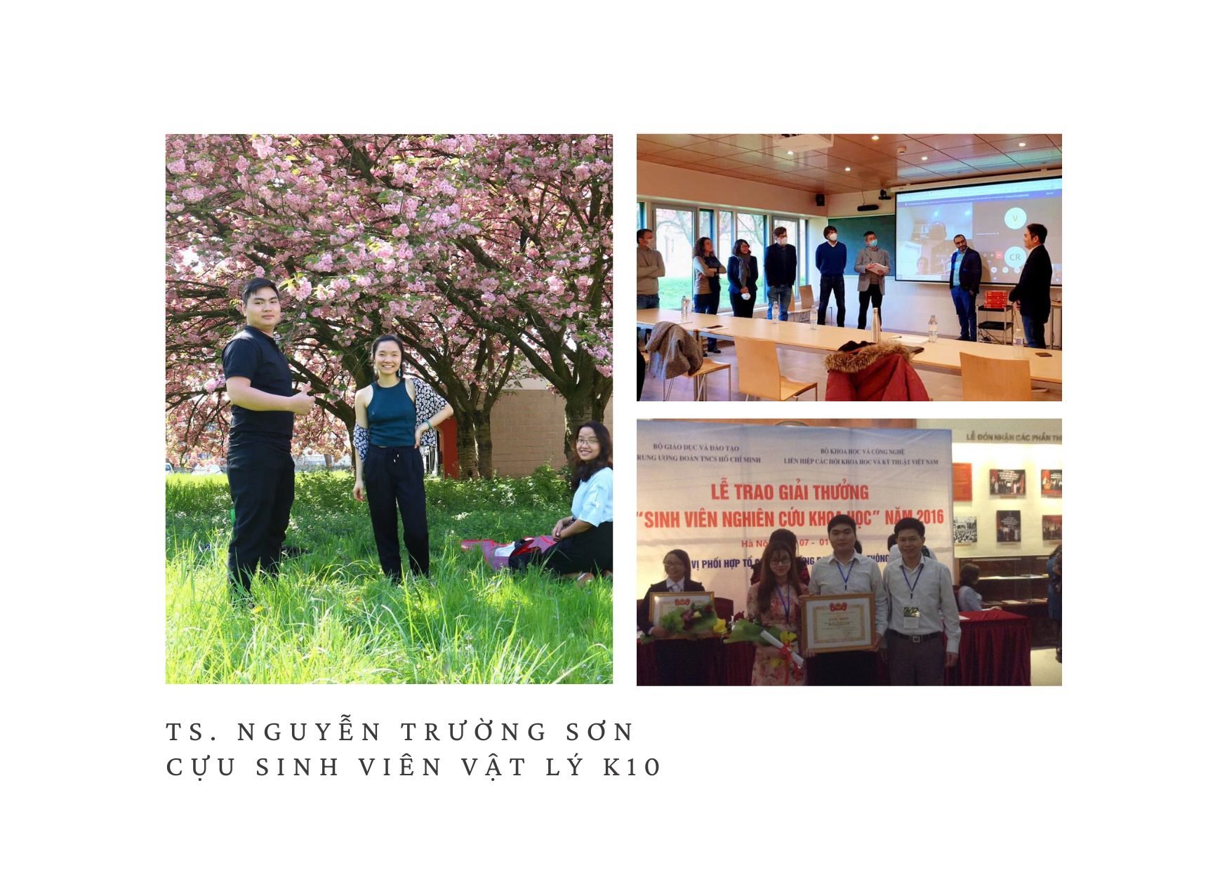 Nguyễn Trường Sơn là cựu sinh viên ngành Vật lý K10 – một trong những sinh viên có thành tích NCKH vô cùng xuất sắc. Sơn đã giành được giải Nhì giải thưởng Sinh viên NCKH toàn quốc năm 2017. Sau khi tốt nghiệp Đại học, Sơn tiếp tục con đường học tập và nghiên cứu tại Trường ĐH Khoa học và Công nghệ (USTH) Hà Nội, trong đó, cơ duyên tới khi Sơn qua Công hoà Pháp để làm thực tập luận văn thạc sĩ. Chuyến đi đã cho Sơn nhiều kiến thức, kĩ năng và trải nghiệm trong môi trường quốc tế. Dựa trên những trải nghiệm và sự đam mê với NCKH và những thành tích xuất sắc, giáo sư tại ĐH Paris 13 đã giới thiệu các suất học bổng Tiến sĩ tại Pháp và Sơn đã xuất sắc nhận 02 học bổng (một là của trường ĐH Paris 13 (mới đổi tên thành: Universite Sorbonne Paris Nord) và hai là của quỹ Labex SEAM (Laboratoire d'Excellence SEAM « Science and Engineering for Advanced Materials and devices). Sơn đã quyết định học Nghiên cứu sinh tại Đại học Paris 13. Năm 2022, Sơn đã bảo vệ thành công Luận án Tiến sĩ Vật lý và hiện đang làm việc tại Viện Jean Lamour - Universite Lorraine - Nancy, Công hoá Pháp.