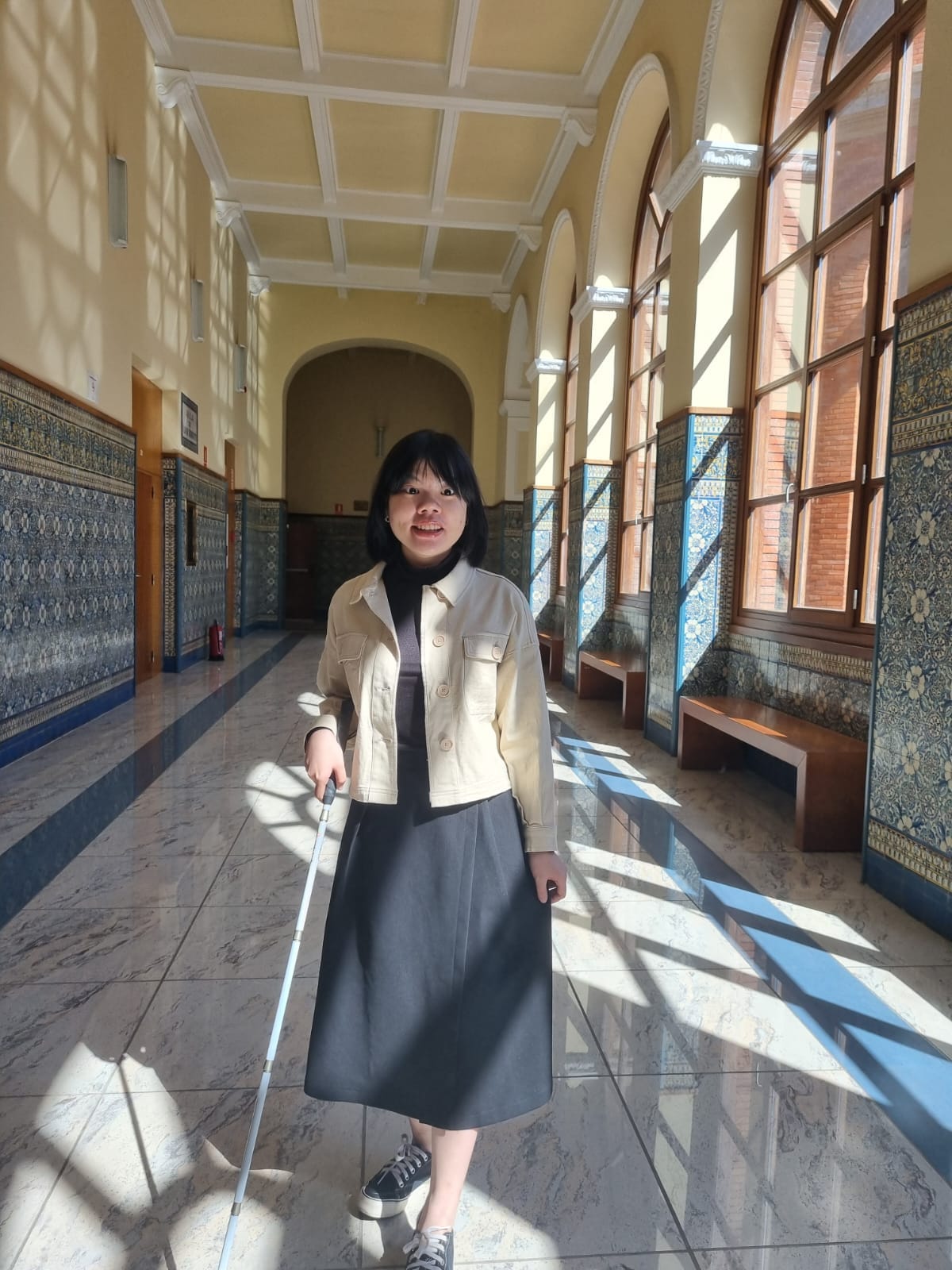 Một trong những điểm nhấn của chương trình là sự hỗ trợ của tổ chức ONCE – tổ chức dành cho người khiếm thị tại Tây Ban Nha. Mỗi tuần, mình đều có buổi gặp gỡ với chú Antonio – nhân viên của tổ chức ONCE. Chú đã hướng dẫn mình cách sử dụng gậy định hướng, giúp mình tự tin hơn trong việc di chuyển từ phòng học 002 đến phòng 211 tại tầng 2, cũng như các lối ra vào và nhà vệ sinh trong tòa nhà khoa Luật. Việc luyện tập này không chỉ giúp mình nắm vững kỹ năng di chuyển một cách độc lập và an toàn mà còn mang lại cho mình cảm giác tự tin hơn trong môi trường mới.