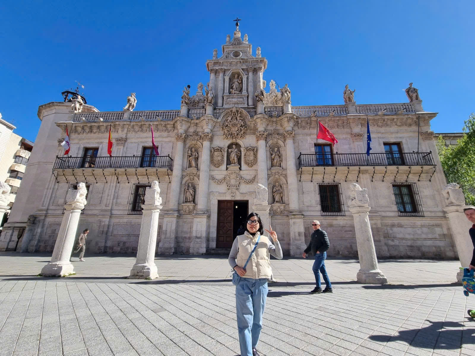 Vào những ngày đẹp trời, mình thường cùng mẹ khám phá thành phố, từ không gian xanh mát bên bờ sông Pisuerga, công viên Campo Grande, đến những con đường nhộn nhịp tại quảng trường Plaza Mayor. Những buổi dạo chơi, thăm chợ trời và lắng nghe âm nhạc đường phố không chỉ làm phong phú thêm trải nghiệm sống mà còn giúp mình hiểu sâu hơn về đất nước và con người Tây Ban Nha. Trong 5 tháng sống tại Valladolid, mình đã có cơ hội tham gia các sự kiện cộng đồng cùng với người dân địa phương như lễ rước Phục sinh Semana Santa, lễ hội mùa xuân với điệu nhảy Jota truyền thống, lễ hội đấu bò tót và lễ ăn mừng đội bóng địa phương Real Valladolid giành vé thăng hạng La Liga...
