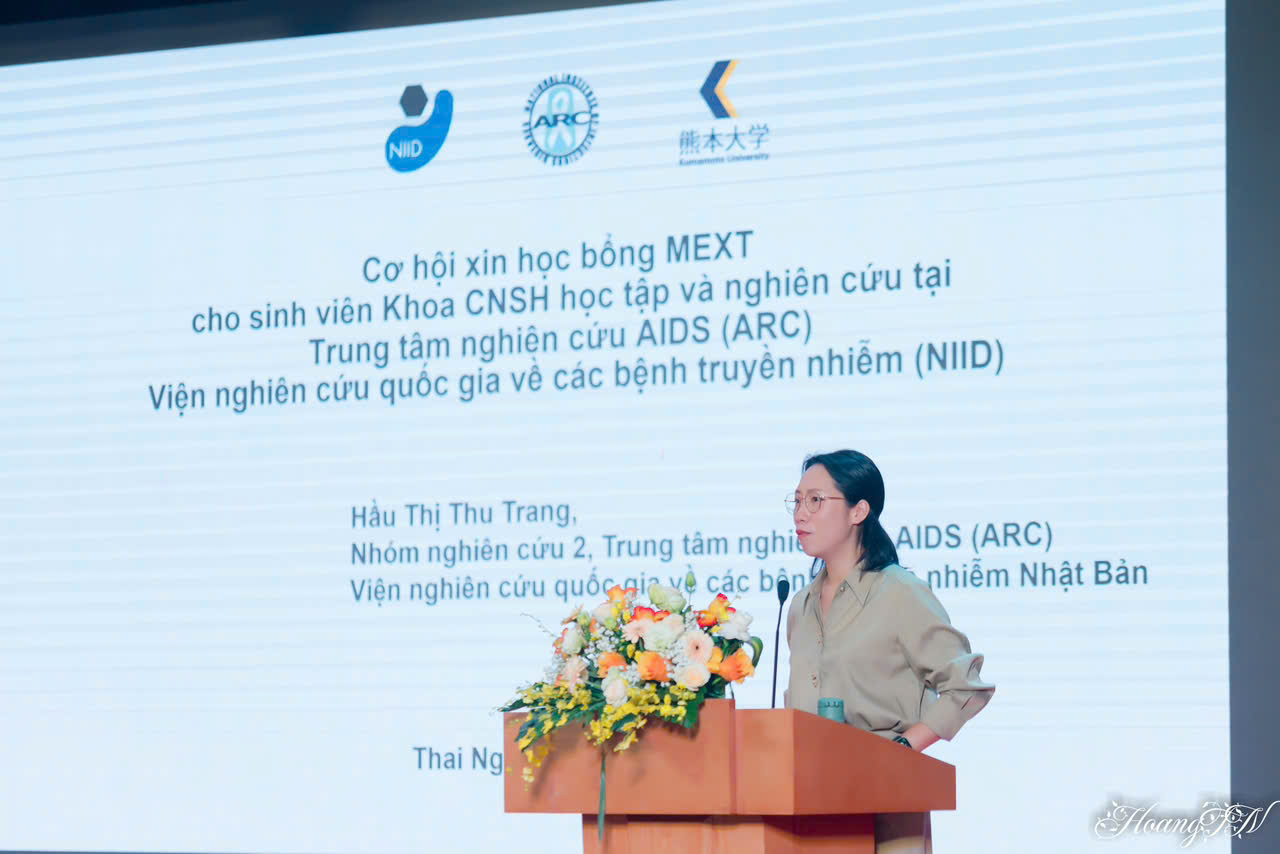 Một điểm nhấn đáng chú ý của chương trình là sự có mặt của TS. Hầu Thị Thu Trang, cựu sinh viên Khoa CNSH, hiện đang làm việc tại Viện nghiên cứu Quốc gia về các Bệnh truyền nhiễm, Nhật Bản. TS. Thu Trang đã chia sẻ kinh nghiệm học tập và công việc của mình, đồng thời đưa ra những lời khuyên quý báu về việc lựa chọn nghề nghiệp sau khi tốt nghiệp. Đặc biệt, TS. Trang đã hướng dẫn và định hướng cho các bạn sinh viên về cách xin học bổng Sau Đại học để có thể học tập và nghiên cứu tại Nhật Bản, cũng như tại phòng thí nghiệm của TS. Trang.