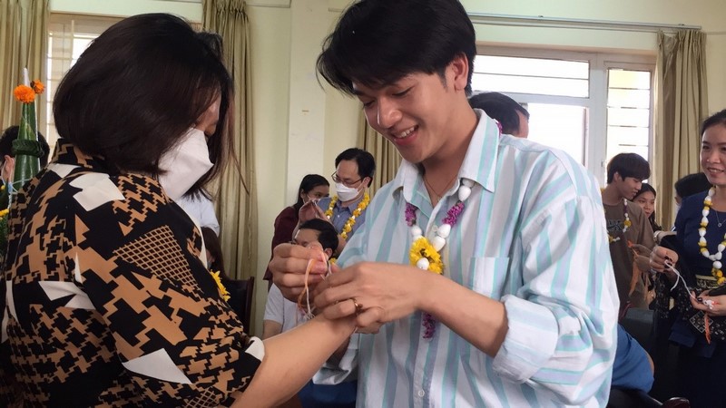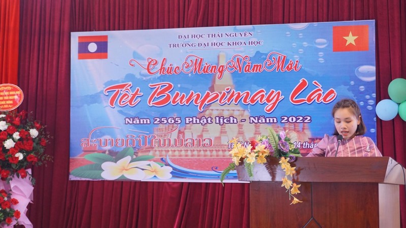 Và cũng thay mặt cho các bạn lưu học sinh Lào, sinh viên Phonesavath PHILARMAKHOTH – sinh viên Lớp KHQL K18, Khoa Khoa học Xã hội và Nhân văn, đại diện cho LHS Lào Trường ĐHKH giới thiệu về ý nghĩa Tết cổ truyền Bunpimay của nước CHDCND Lào và các nghi lễ trong dịp Tết như: nghi thức buộc chỉ cổ tay, té nước thơm, …cũng như bày tỏ tình cảm, sự trân quý với các thầy cô trong Trường với những lời chúc mừng năm mới tốt đẹp, chân thành.