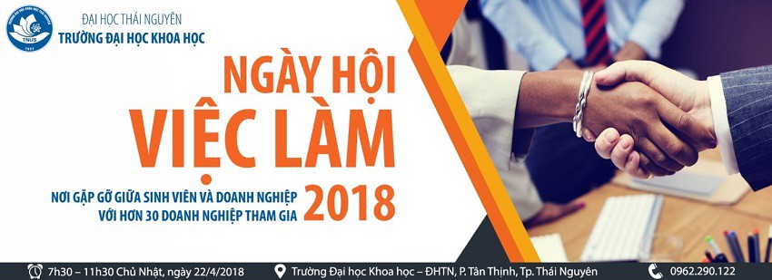 TNUS – JOB FAIR 2018 sẽ được tổ chức từ 7h30 – 11h30 ngày 22 tháng 4 năm 2018 tại giảng đường 3B và Hội trường nhà Hiệu bộ Trường Đại học Khoa học Thái Nguyên. Ngày hội việc làm và kết nối doanh nghiệp 2018 là sự kiện được tổ chức lần thứ 2 và sẽ được tổ chức thường niên trong những năm tới, đây sẽ là cầu nối uy tín giữa các doanh nghiệp và các bạn sinh viên đã và đang theo học tại trường.