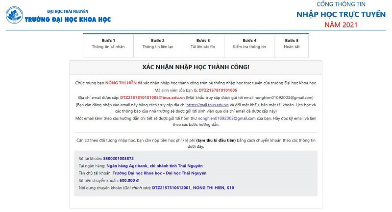 Trong những ngày đầu tiên nhập học, nhiều thí sính hoàn tất thủ tục nhập học trực tuyến thuận lợi và nhanh chóng. Hy vọng, trong những ngày sắp tới, các thí sinh trúng tuyển vào Trường sẽ tiếp tục sớm hoàn thành thủ tục nhập học, chính thức trở thành tân sinh viên của TNUS.