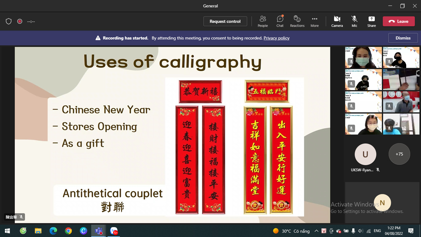 Ngay từ buổi đầu tiên, các bạn đã được nghe giới thiệu chung về đất nước Đài Loan và Trường Đại học Trường Vinh; được chia thành các nhóm nhỏ để tương tác, giao lưu cùng nhau. Sang ngày thứ hai, các sinh viên của trường CJCU đã giới thiệu đến mọi người về văn hóa, lịch sử, tín ngưỡng và tôn giáo của Đài Loan và tham quan bảo tàng ảo – bảo tàng CHIMEI. Trong ngày thứ 3, các bạn có cơ hội tìm hiểu sâu hơn về văn hóa ẩm thực Đài Loan và thực hành làm hai món ăn: Egg Pancakes (Bánh kếp trứng) và Sugar Coated Haws (kẹo hồ lô). Vào ngày cuối cùng 04/8/2022, các bạn được học và thực hành viết thư pháp Trung Quốc. Các sinh viên tham gia trình bày tại chương trình sẽ được cấp chứng nhận hoàn thành trải nghiệm Trại hè 2022 CJCU Global Cultural Summer Camp.