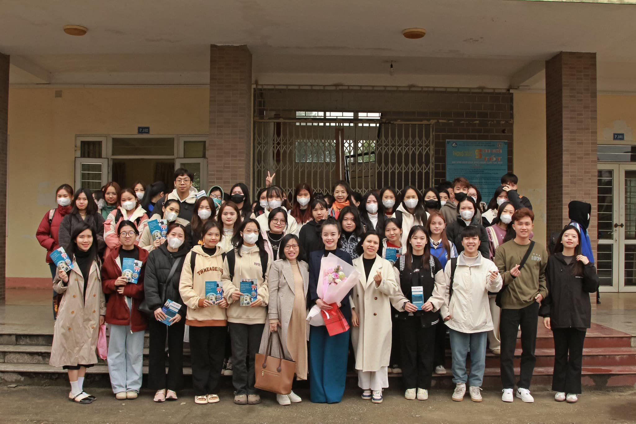 Bà Long Thị Thu Hằng chụp ảnh lưu niệm cùng giảng viên và sinh viên lớp Hàn Quốc học K19