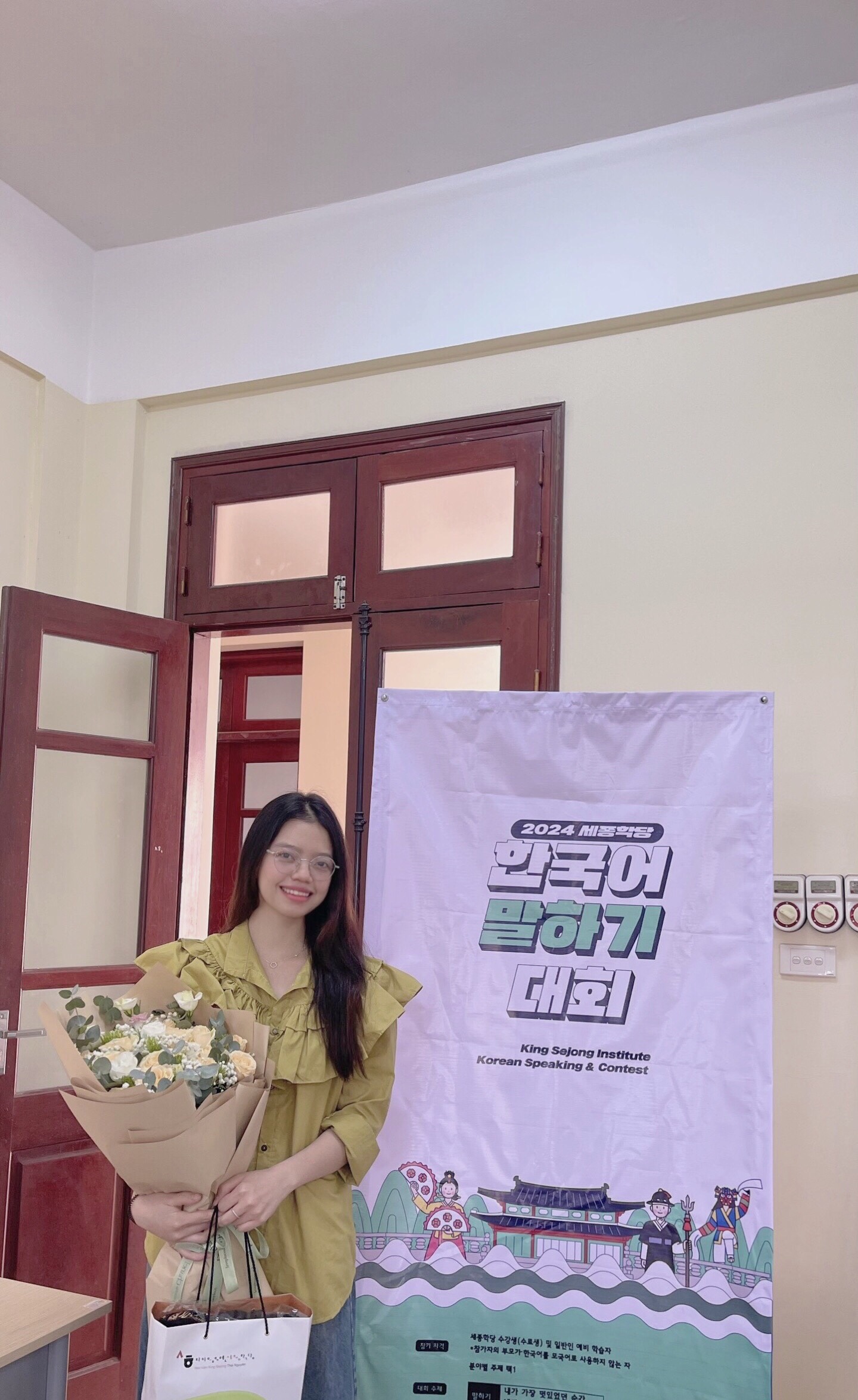 Đối với bản thân em, trong quá trình vươn tới giải Nhất trong cuộc thi nói tiếng Hàn của học Viện King Sejong Thái Nguyên, em đã nỗ lực chăm chỉ luyện tập rất nhiều, em đã nghe và tham khảo những bài dự thi của các bạn học sinh đạt giải Nhất năm 2023, luyện nói, luyện phát âm từng ngày để có được một bài nói chỉn chu nhất. Mặc dù đã trải qua nhiều ngày sau khi biết kết quả nhưng em vẫn cảm thấy xúc động như lúc được gọi tên thông báo giải Nhất. Có lẽ em sẽ không bao giờ quên được khoảnh khắc tuyệt vời ấy."