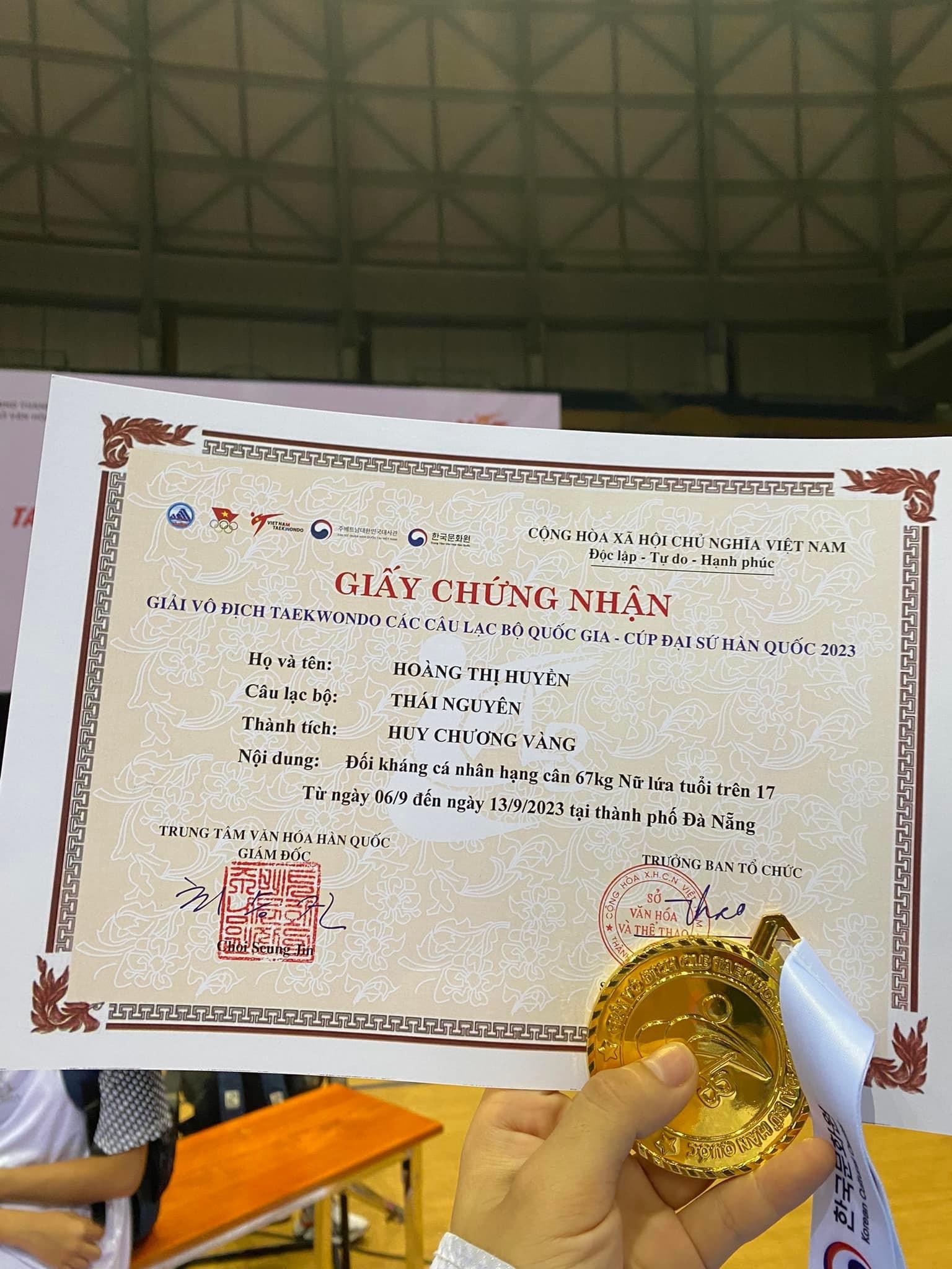Được biết, ngoài thành tích nổi bật tại giải lần này, Huyền cũng xuất sắc giành Huy chương Vàng nội dung đối kháng cá nhân tại Giải vô địch Taekwondo các lứa tuổi trẻ quốc gia tổ chức tại Hà Nội vào tháng 7/2023.